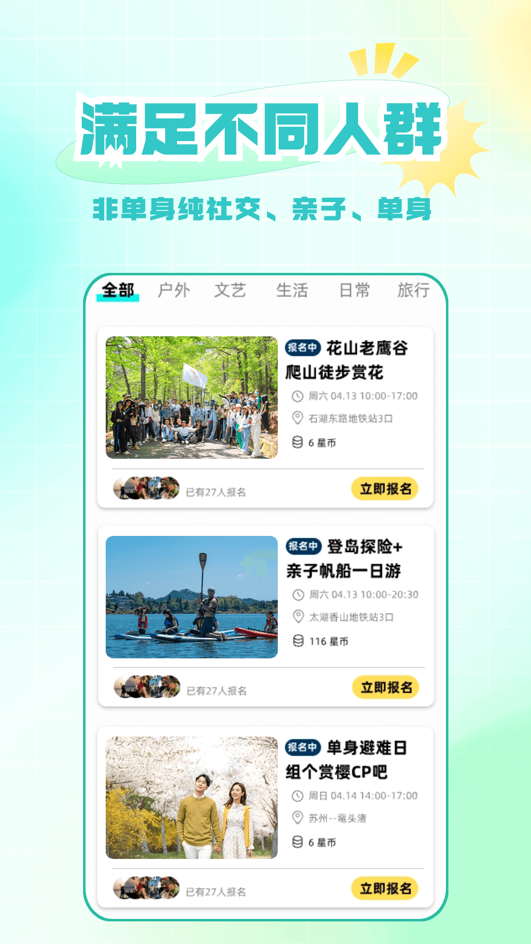 不管你是单身人士,已有伴侣的非单身族,还是身为宝妈宝爸的人,又或者是社交达人,闪遇SHINING都有适合你的活动。