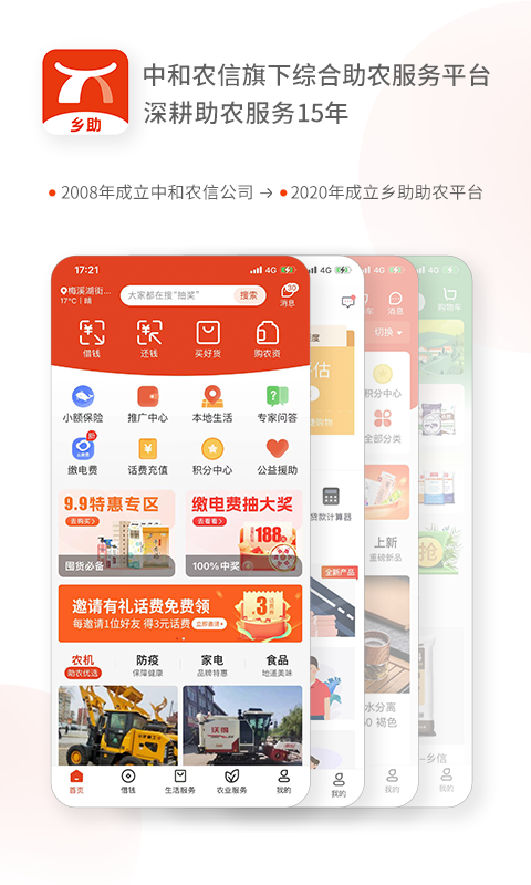 乡助经过全面的升级与重新整合,将“小额信贷”、“小额保险”、“农资电商”、“本地生活”、“乡助优选”、“+乡课堂”、“紧急救助”、“农品直采”这八大模块功能进行了全方位的升级,从而蜕变为一个综合助农平台。“乡助”,它蕴含着这样的理念:乡野之间的一切需求与渴望,中和农信都将全心全意地给予帮助!