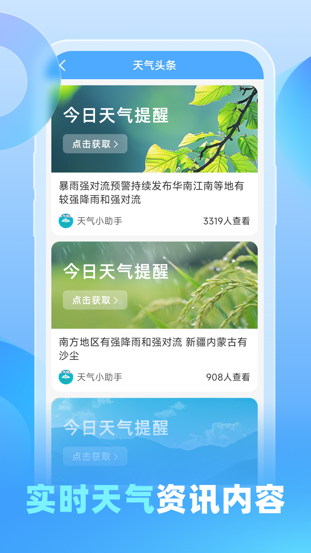 1)实时天气信息:应用能够提供当日的实时天气状态,包括气象、温度、风级、风速、气压、湿度和体感温度等信息。