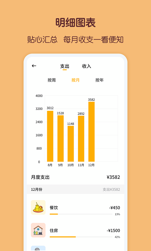- 统计视图:按周、按月、按年统计记账数据,折线图、饼状图、柱状图一目了然