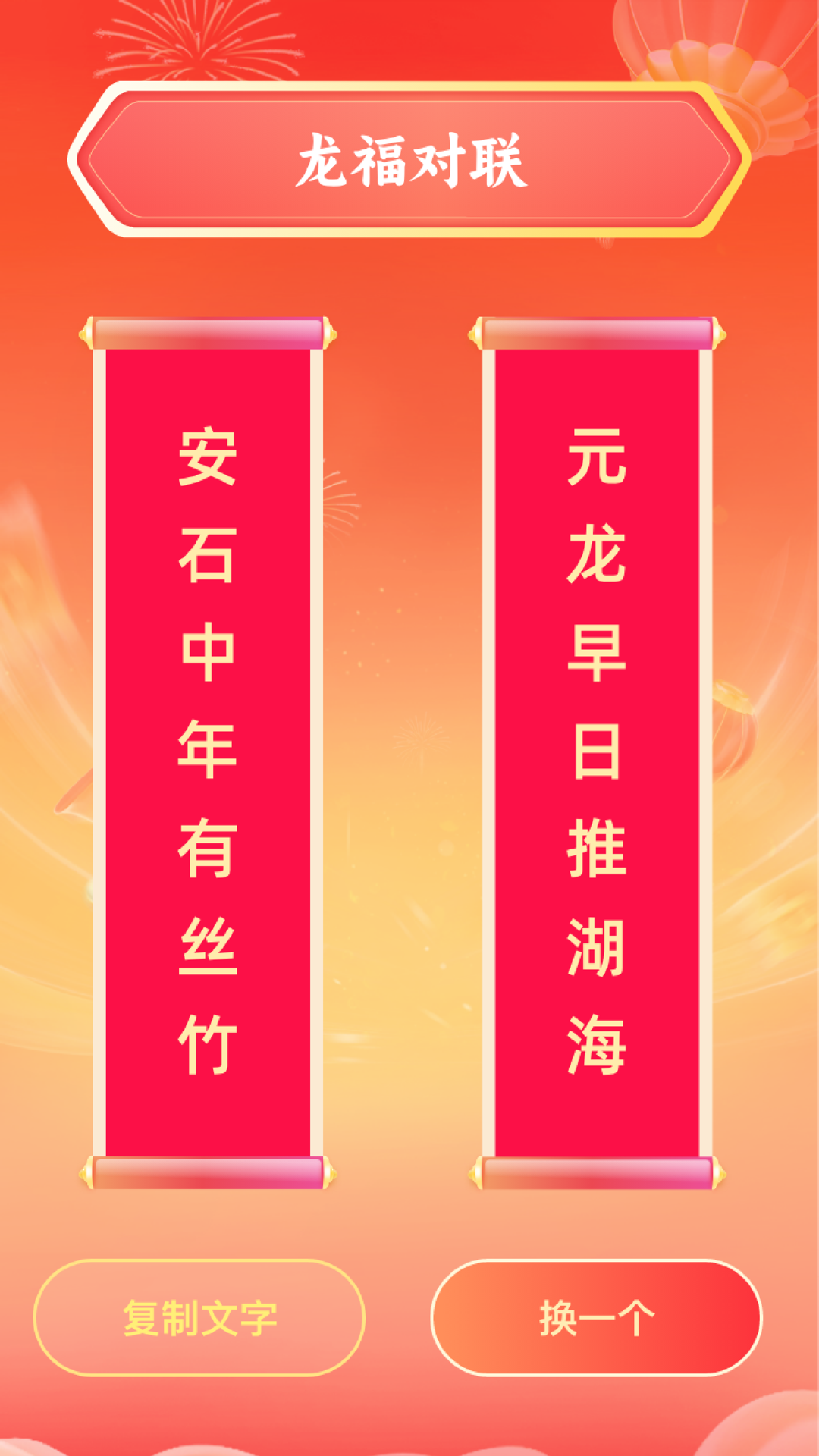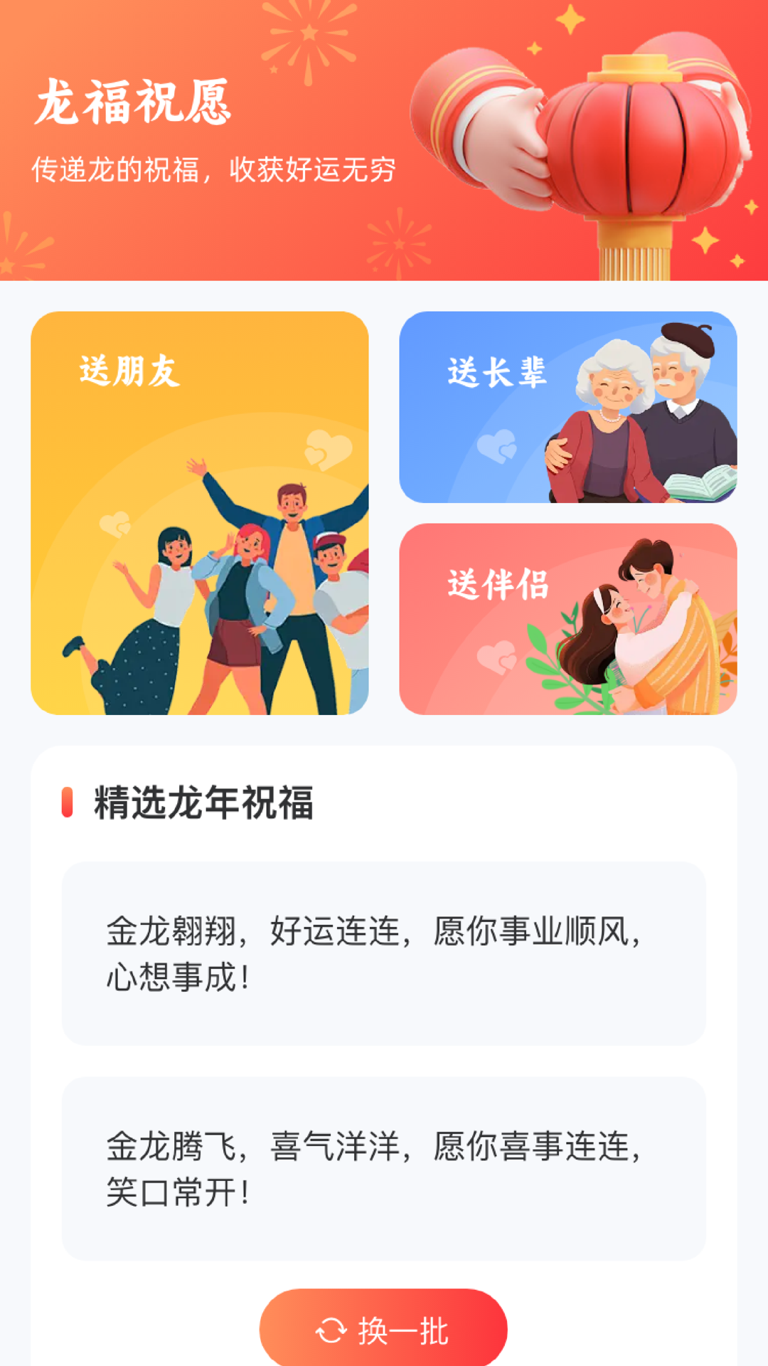 龙福天下是一款祝福字句工具类软件,具有龙福祝愿功能,包括给朋友、长辈、情侣的祝福语句和龙年祝福,给大家带来好运和快乐;以及龙福对联功能,可以学习传统文化,提高自己的知识水平和文化素养,喜欢的话,快来下载试试吧~