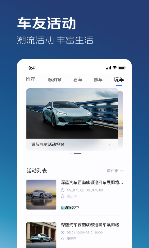 欢迎来到深蓝汽车App,深蓝宇宙有着丰富的资讯内容等待您来探索。这里有趣味十足的线上线下活动,这些活动能够将深蓝车友紧密地联系在一起,大家共同探索深蓝汽车带来的智能驾驶体验。此外,还有在线管家,它将引领您感受数字科技的魅力,和您一同编译精彩的生活。