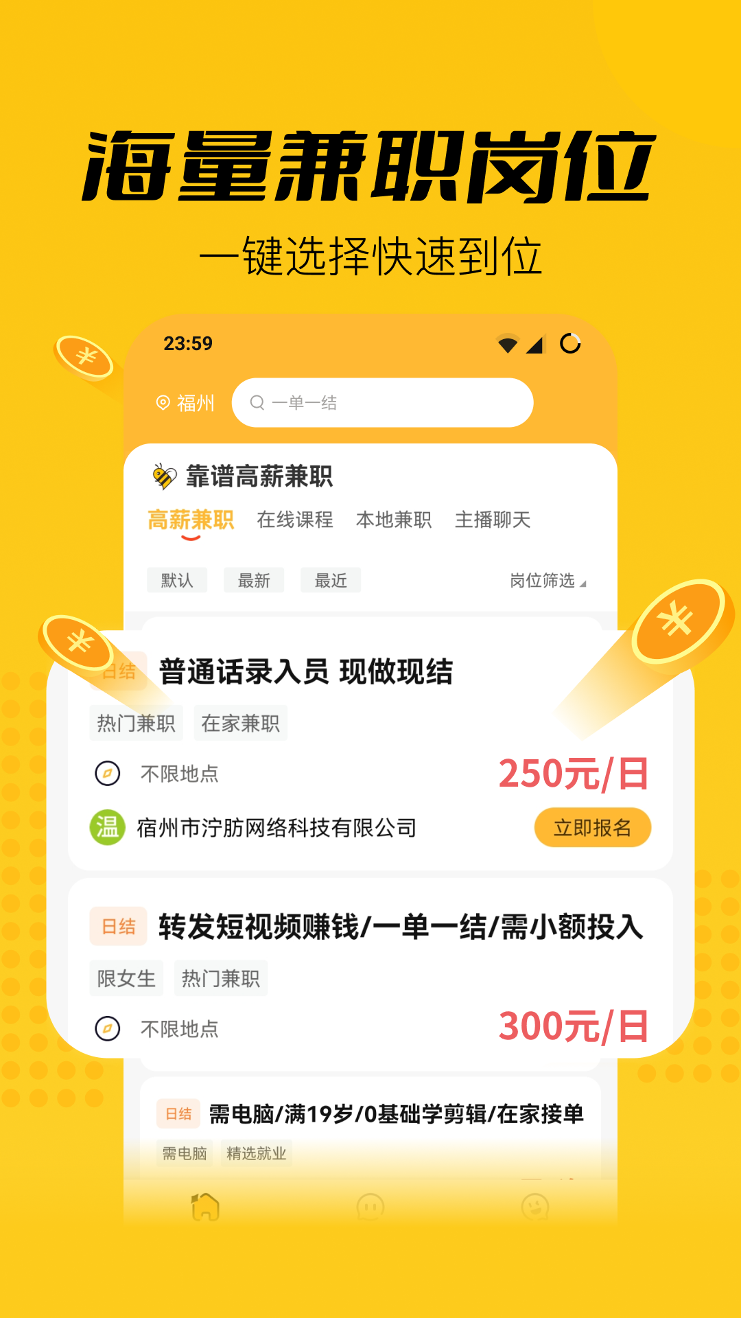 兼职蜂是一款专业服务学生宝妈上班族群体的招聘兼职、实习求职找工作的招聘找工作求职平台。