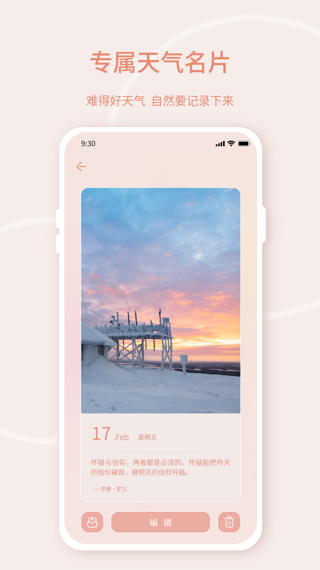 -- 天气明信片:每一天的阳光都是独特的,您可以把今日的好天气记录下来,分享给亲朋好友,也可以留存起来送给未来的自己。