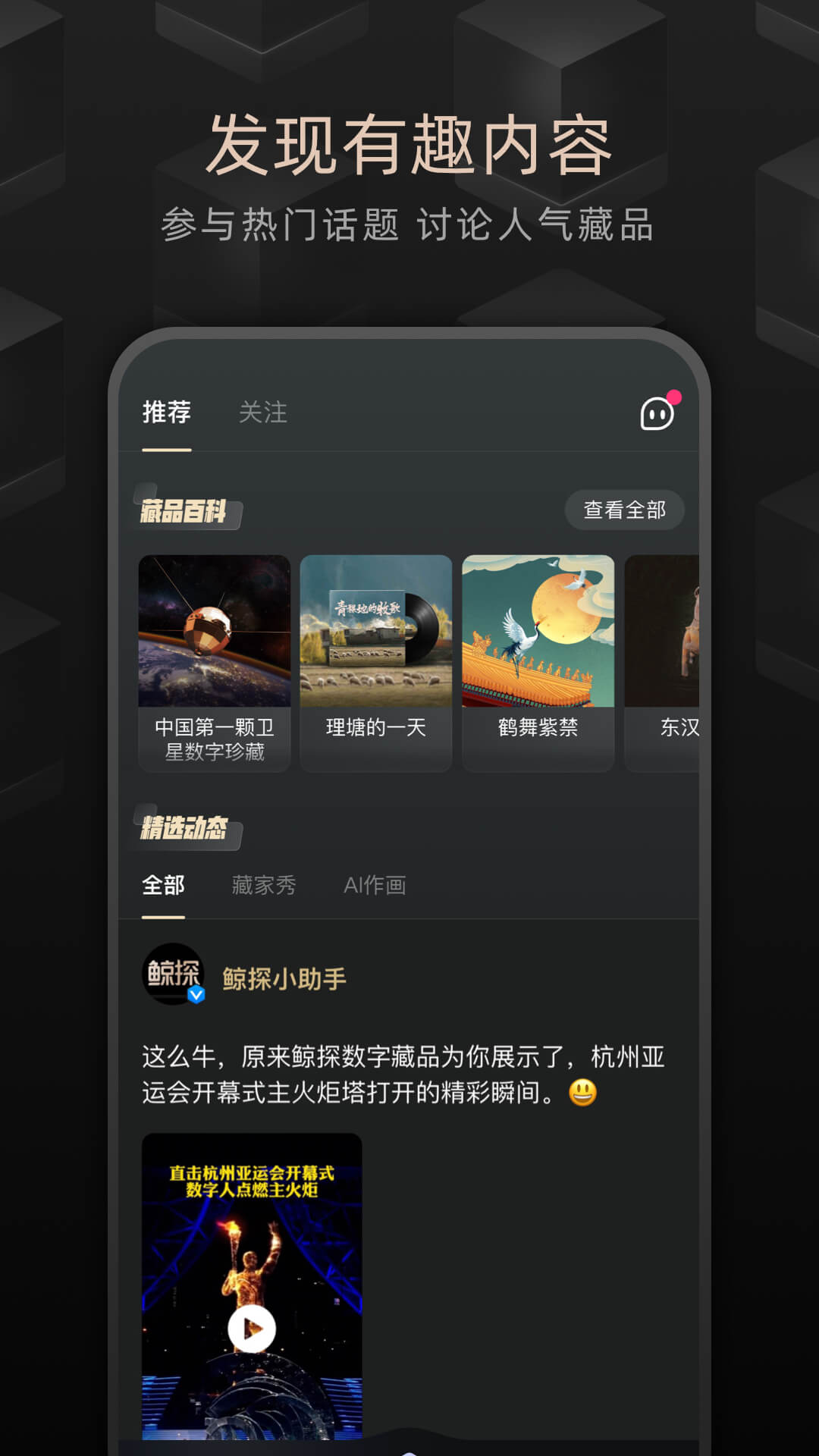 选择鲸探,就能拥有专属于你的数字藏品,进而拥抱光辉灿烂的传统文化与现代科技。鲸探APP将为您开启数字化收藏与交流的新空间。