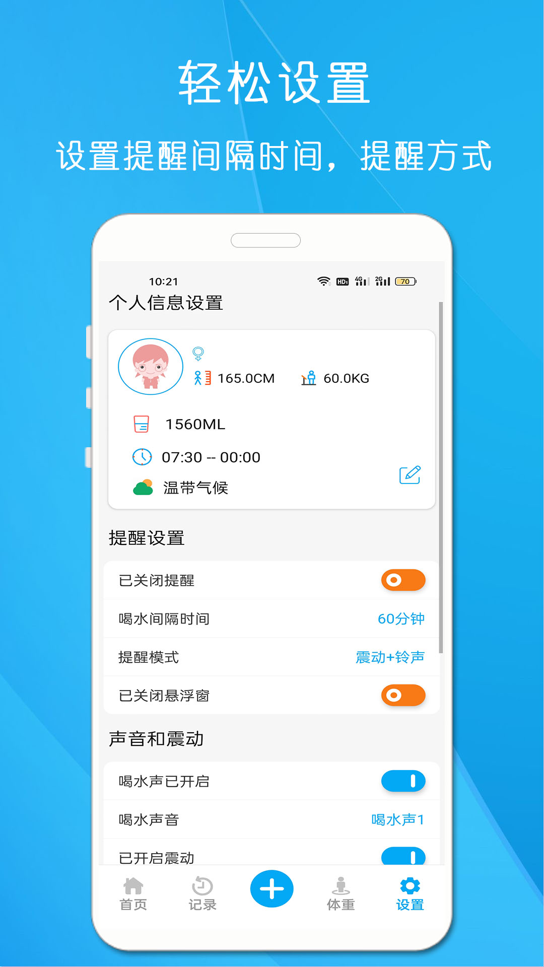 每日喝水提醒是一款风格简约的定时提醒喝水软件,堪称您专属的喝水小助手。它能为您提供多方面的功能:您可以自行设置响铃或者震动来提醒自己喝水,还能对提醒间隔、喝水声音进行个性化设置;它能够记录您的喝水情况、起床与睡眠时间、体重信息,帮助您设立减肥目标,设定喝水目标,准时发出提醒,让您不会错过每次喝水的时间。同时,您还可以自定义喝水的具体时间以及喝水容量等。通过使用这款软件,健康喝水,让您喝出健康与美丽。