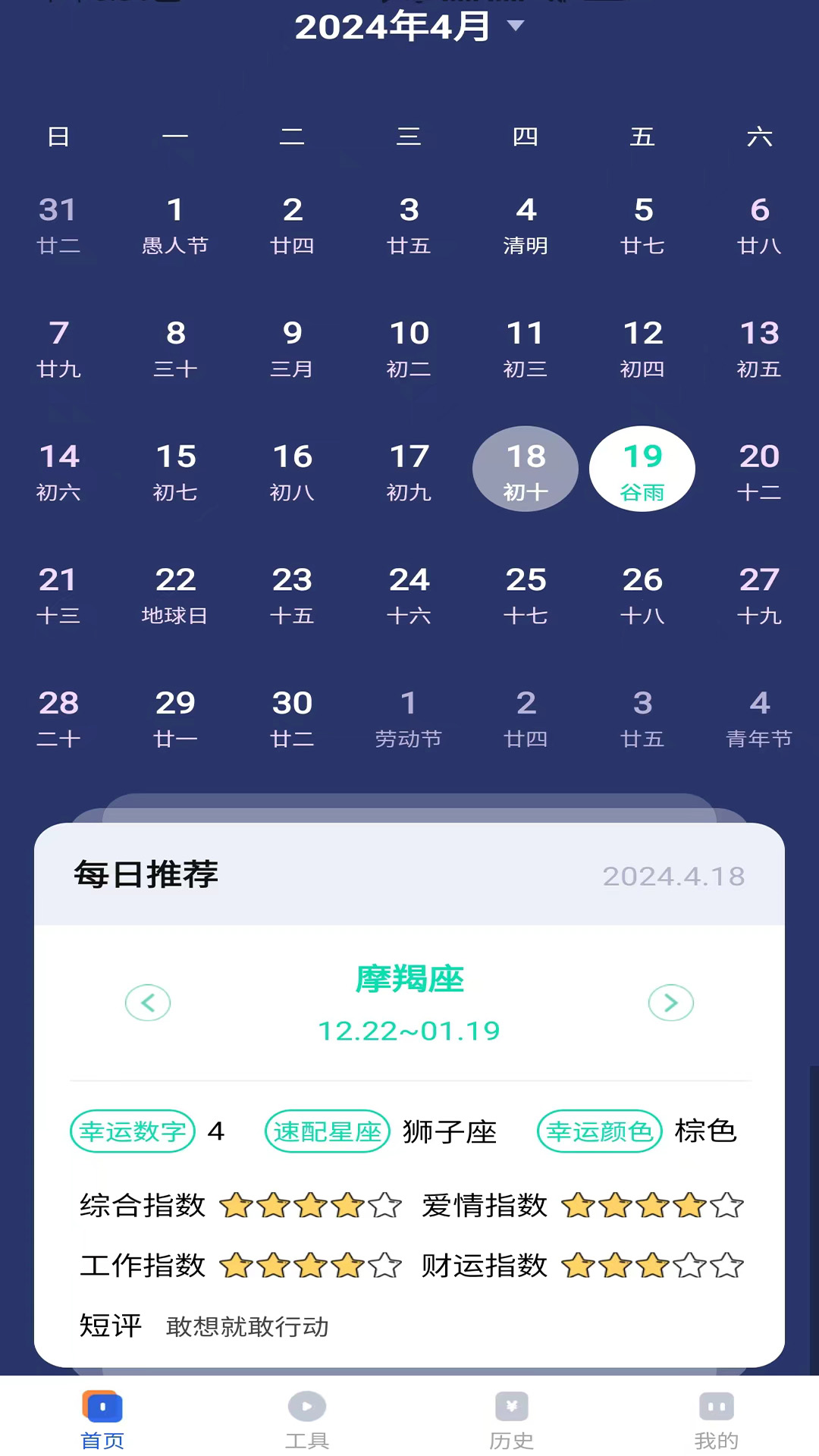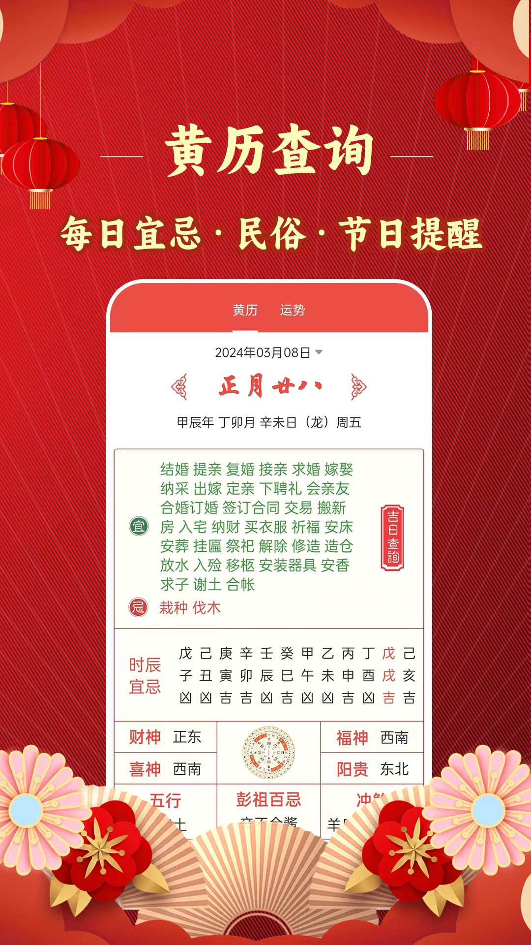 - 黄历方面:提供黄历宜忌、吉日查询等功能。