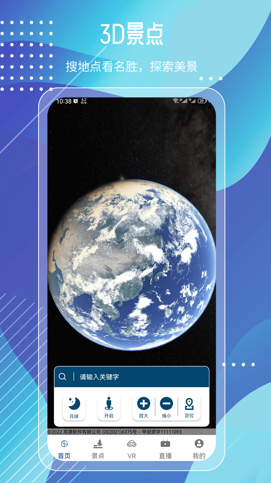 其三维地球功能能够逼真地还原地球表面,您只需手持手机,就能将全球的壮丽风光尽收眼底;卫星地图提供高清卫星影像,助您全面了解各地的地形地貌,为您的行程规划提供更好的依据;国外景点板块,让您轻松探索国外热门景点,即便足不出户,也能感受异国风情的独特魅力;国内景点功能带您畅游国内的美景胜地,深刻体会中华文明的博大精深;VR景点借助虚拟现实技术,使您可以360度无死角地置身于热门景点之中,尽情享受仿若真实的奇妙感受;景点直播能够让您实时观看全国热门景点的视频直播,实现远程旅行,尽情饱览绝美风光;探索月球功能则带您涉足神秘的月球表面,近距离探寻月球的奥秘;地址搜索功能可快速且精准地搜索全球范围内的地址信息,助力您迅速锁定目标地点。