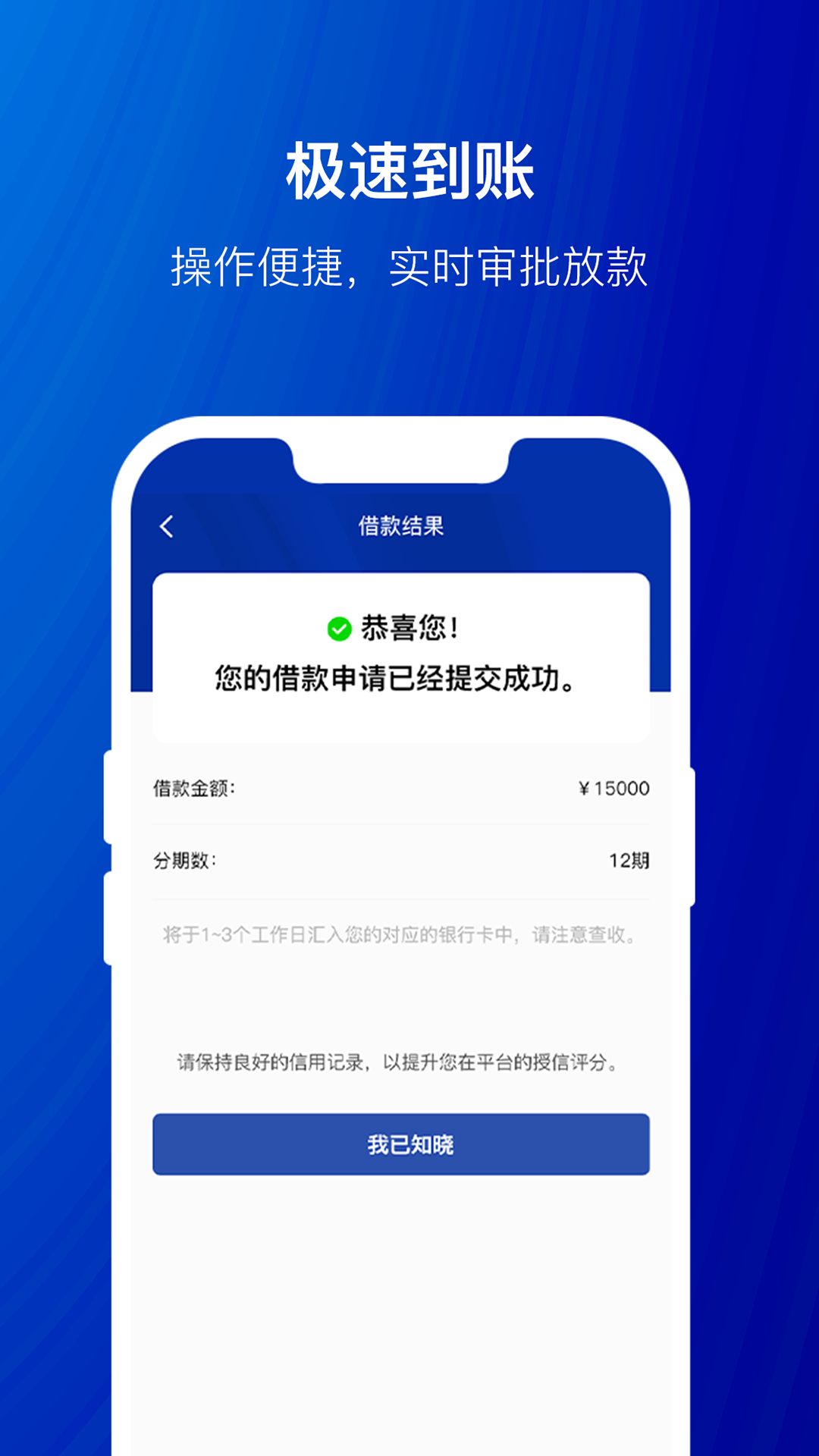 3. 放款迅速:借款流程简便,在授信成功之后,最快可在1分钟内放款。