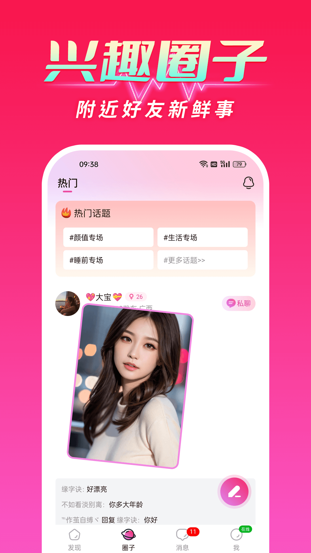平台上的用户24小时在线,大家可以尽情诉说甜言蜜语,享受爱聊的乐趣。同时,还有直播互动环节,让你能够充分展示自己或者发现有趣的人。你可以分享自己的生活动态,去探寻附近的单身异性,一起聊聊人生百态,倾听彼此灵魂深处的声音。