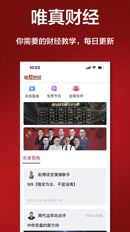 唯真财经——爱股票投教版,能让用户随时随地便捷观看教学视频。该软件设有在线视频、节目直通车、名师专栏等模块,用户可依据个人喜好轻松观看视频。我们的节目每日都会更新视频资料,以供用户学习。