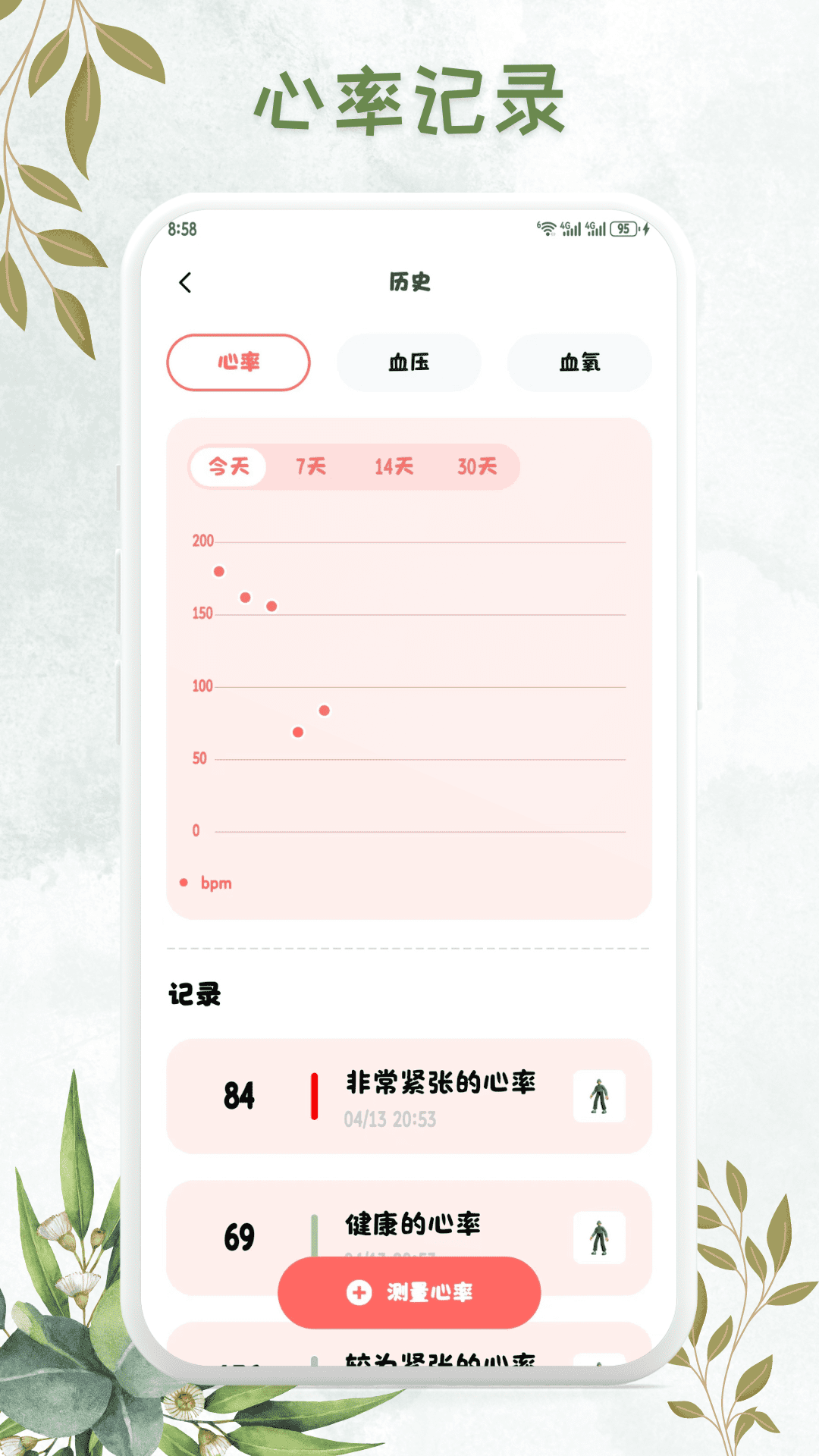 建议您每天使用「心率检测 - 心跳脉搏检测&血压血氧结果记录」测量心率或者记录血压。这样有助于您实时掌握心率走向,从而更好地了解自身身体状况。