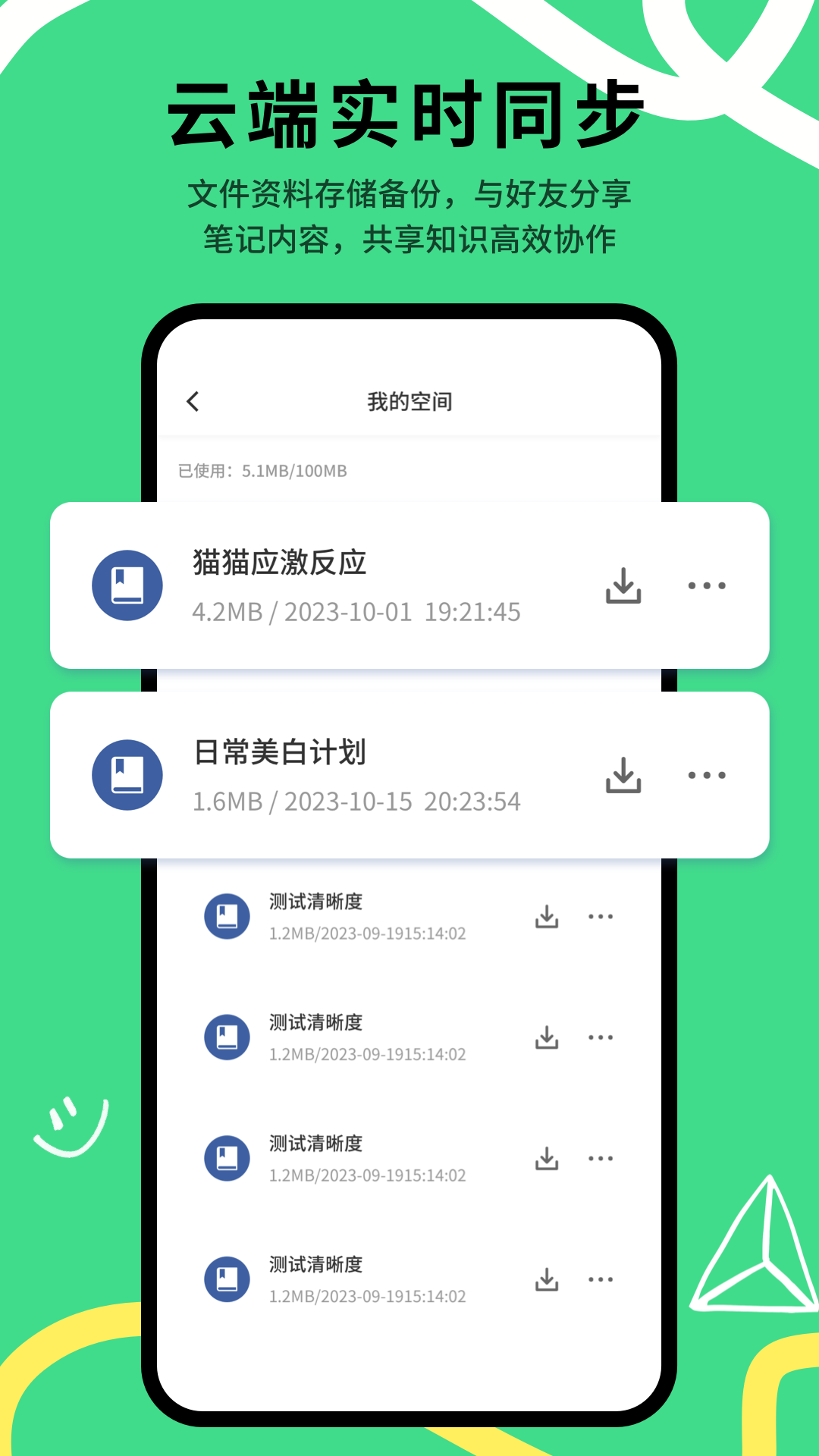 -云端存储文档资料,更换设备也不丢失,储存更安全,随时查看编辑笔记,多端自动实时同步,交流更方便,共享知识高效协作