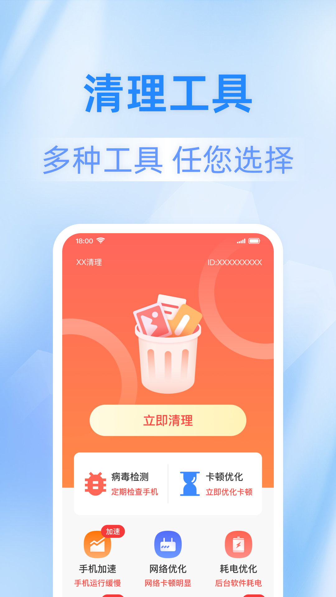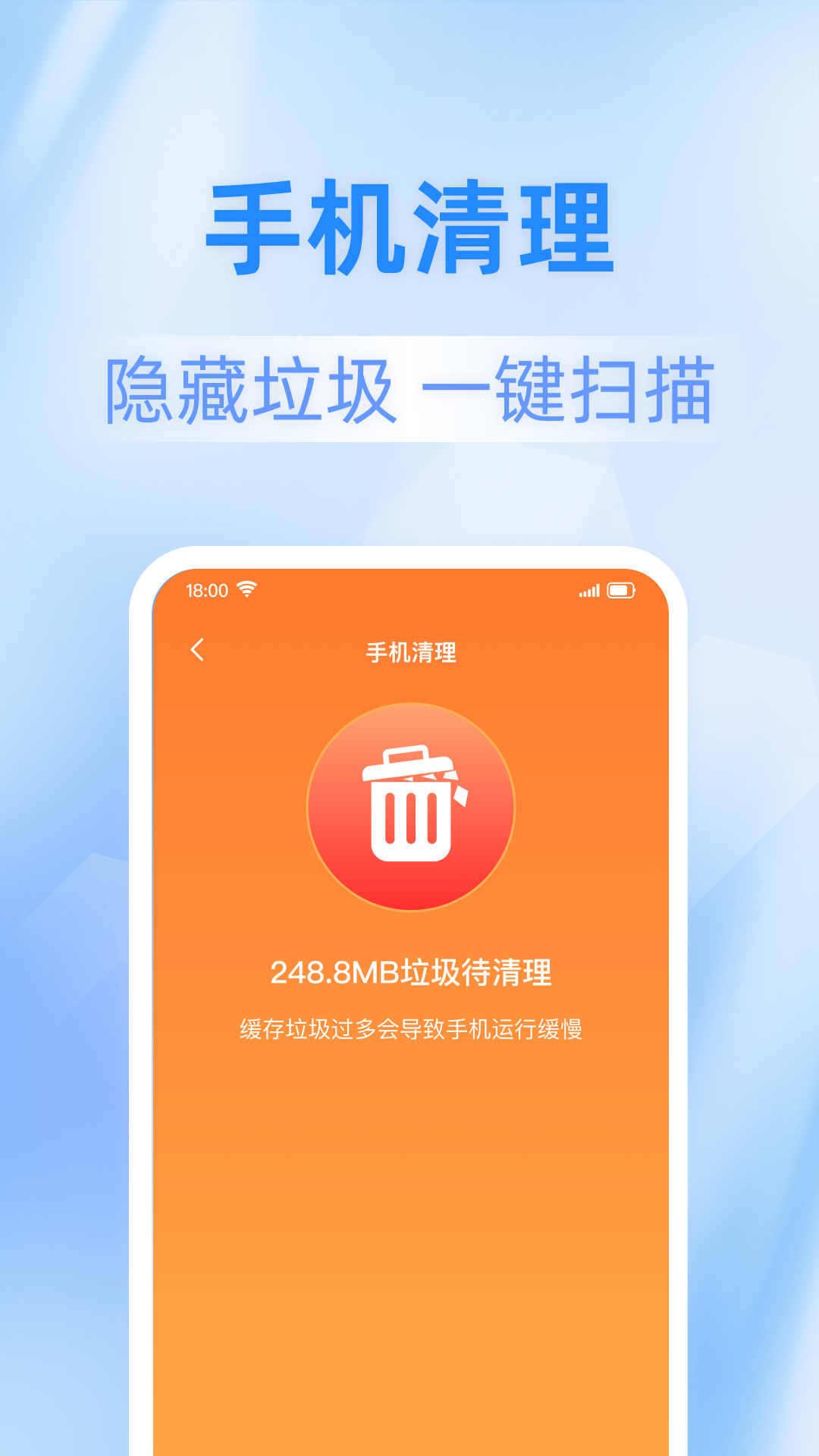 1、一键清理:界面中央醒目的白色垃圾桶图标,一键点击即可快速扫描并清理手机中的无用缓存、临时文件、残留数据等垃圾文件,释放存储空间,提升手机运行速度。