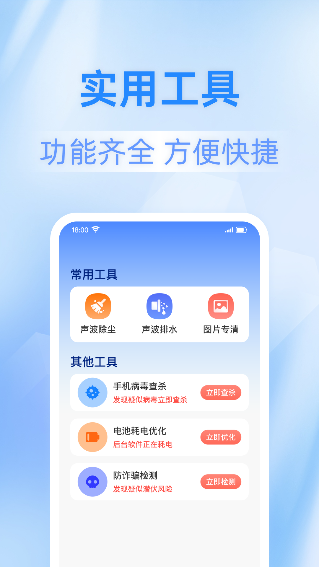 5、工具集成:汇聚了多种常用功能,如“声波除尘”、“声波排水”等独特清理工具,以及“图片专清”、“手机病毒查杀”、“电池耗电优化”等实用功能,满足您日常及深度优化的各种需求。