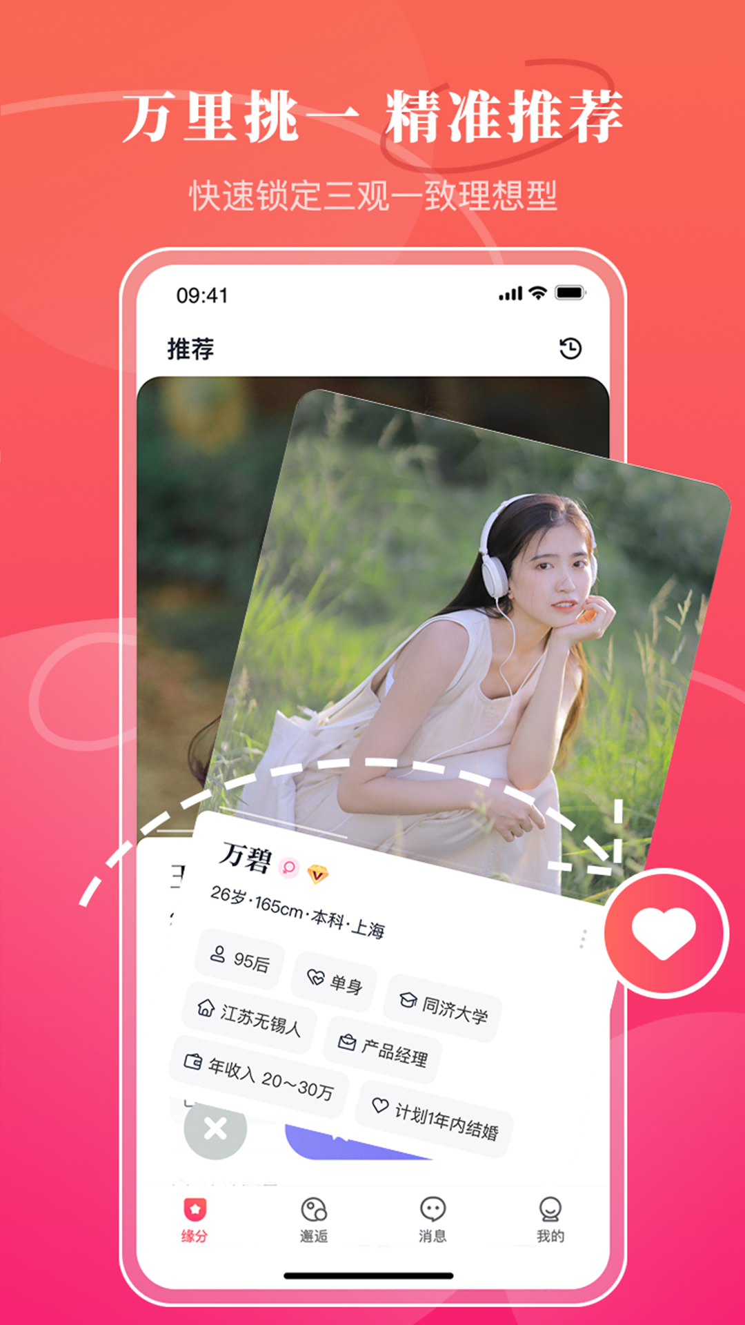 每天都会精准推荐优质的异性,丰富的资料展示能帮助你迅速锁定与自己三观一致的理想对象!