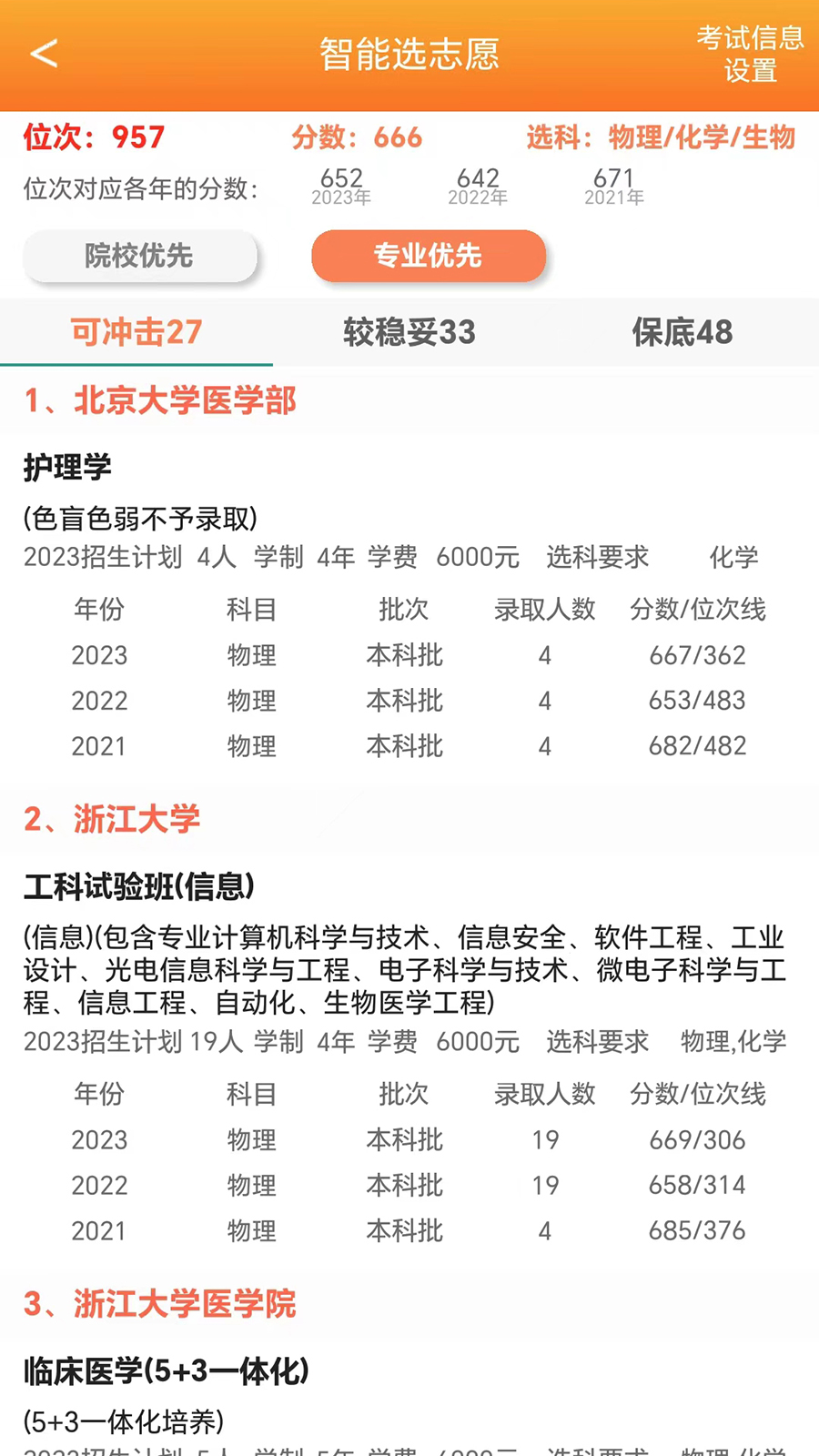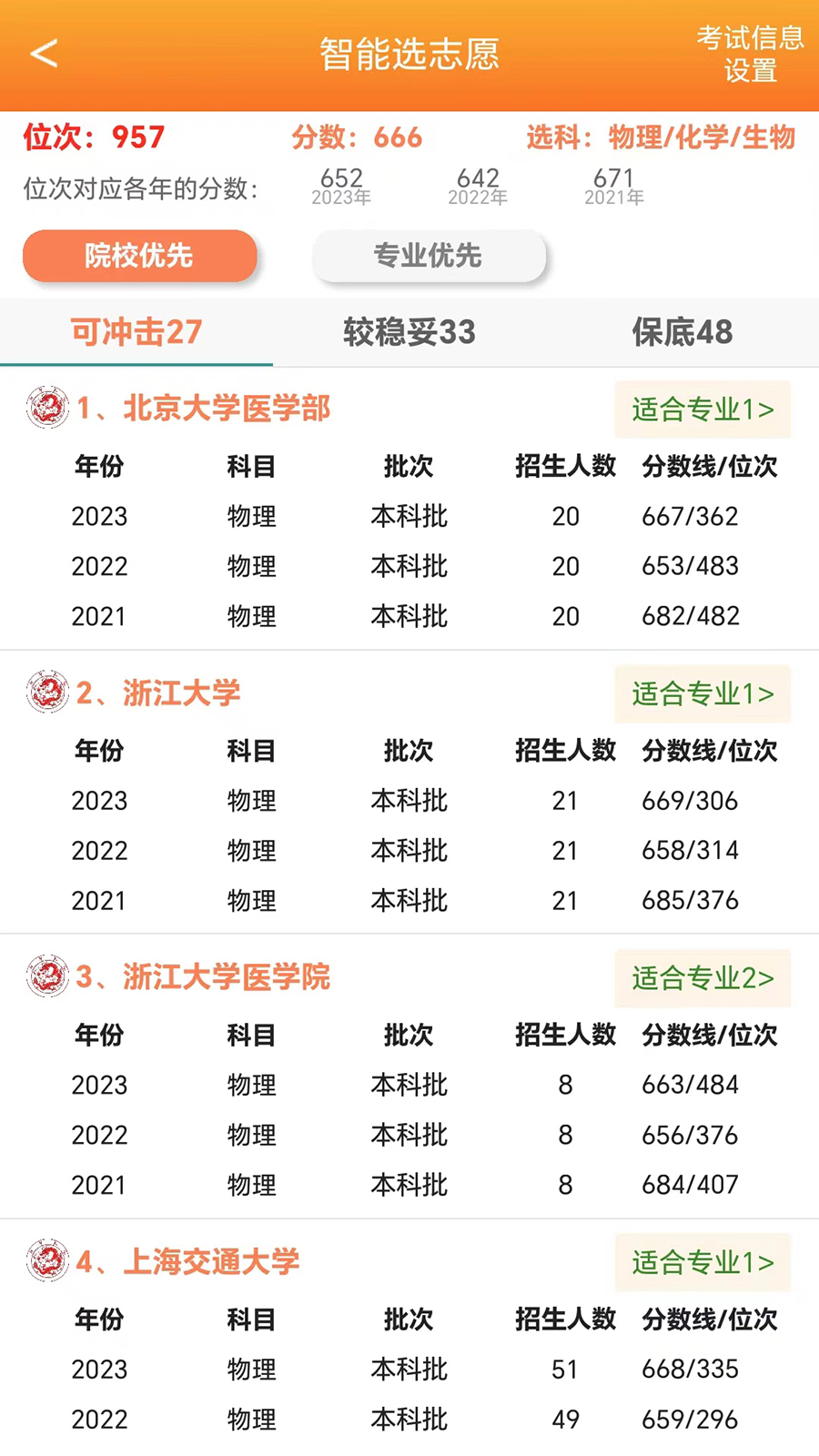 考生只需填写预估或者实际的高考分数,系统就会凭借智能算法,依据考生的分数生成推荐院校与专业,并按照冲刺、稳妥、保底这三个类型进行分类。在推荐院校中,还会展示各专业历年的招生人数、录取分数线,真正实现了一键推荐。
