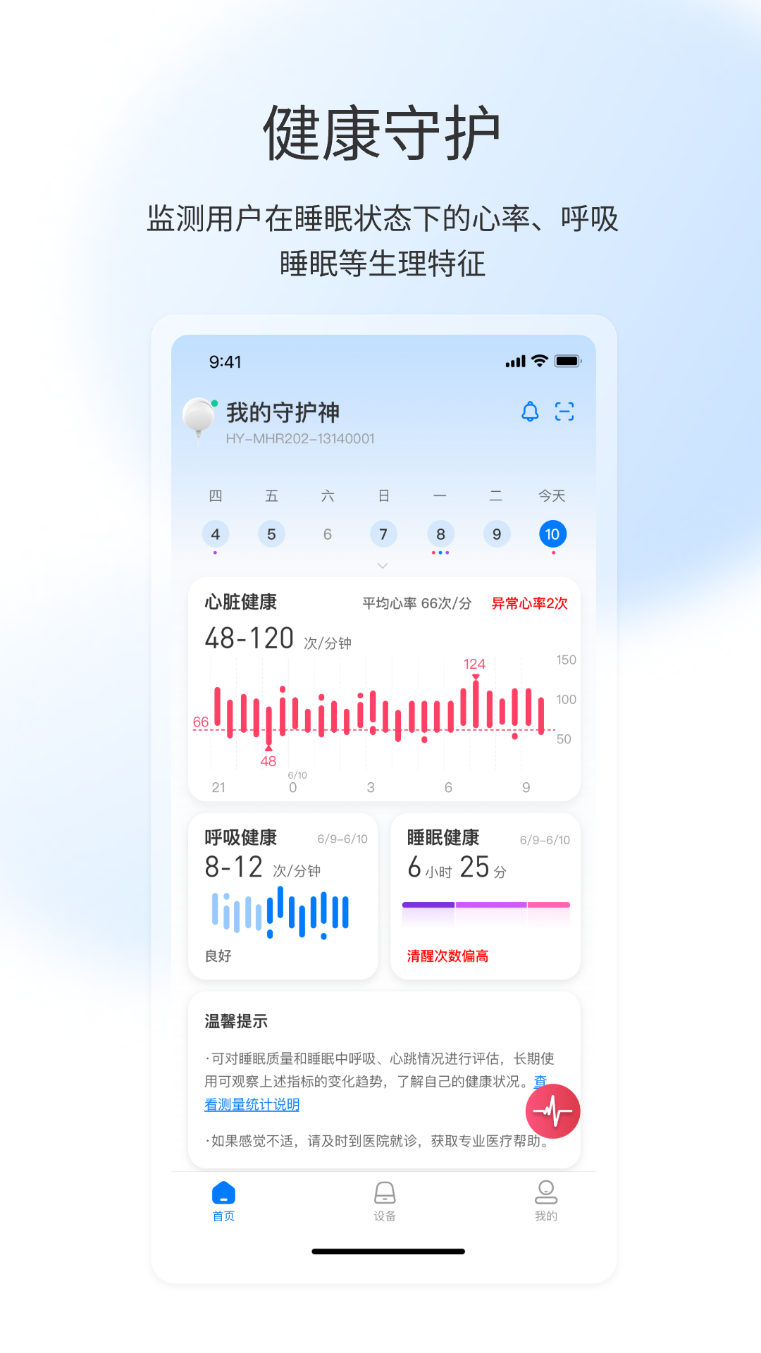 借助屹家健康这款应用,用户可以查看自己在睡眠状态下心跳和呼吸的规律以及变化情况,从而能够随时掌握自身和家人的身体状况。