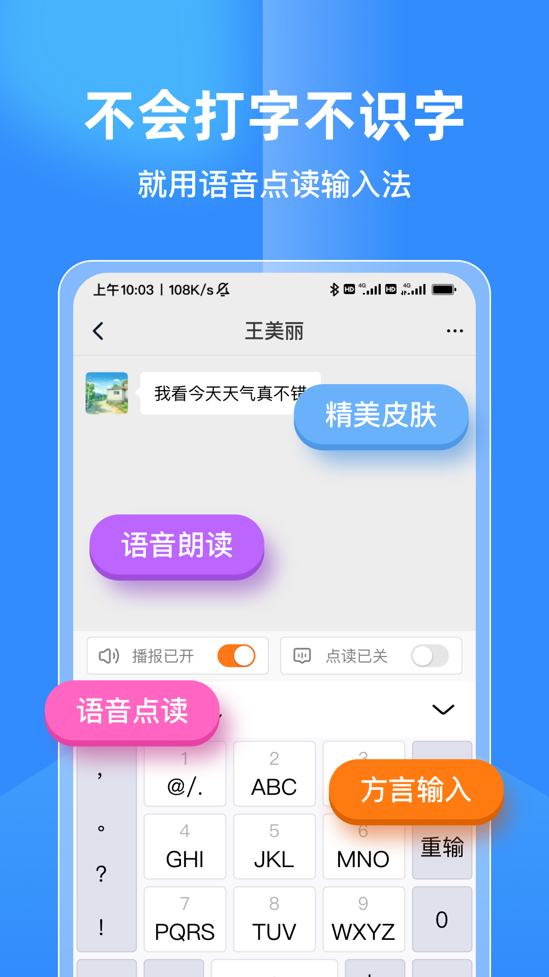 语音点读输入法是一款纯净、好用的输入法,不仅包含了一般输入法的中英文输入、词库、皮肤等功能。同时在功能上做了多项创新与改进