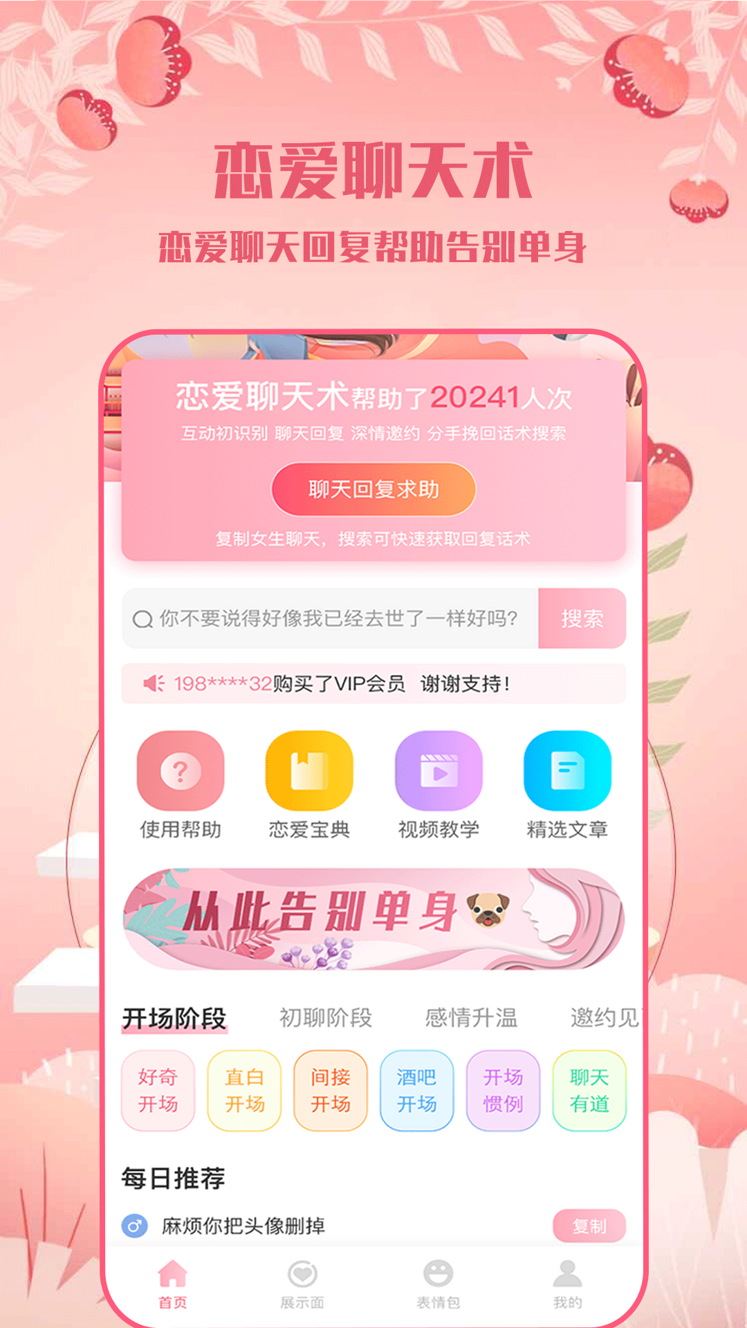 一款收录超百万话术的聊天小助手,集合可搜索恋爱话术,经典案例与聊天实战,情侣头像、恋爱表情包、持续更新。