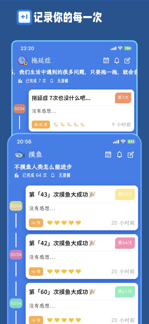 计次郎以列表展示计次情况,方便您回顾过往经历。您还能通过日志记录当时的情形与心情,这有助于您更好地规划下一次行动。