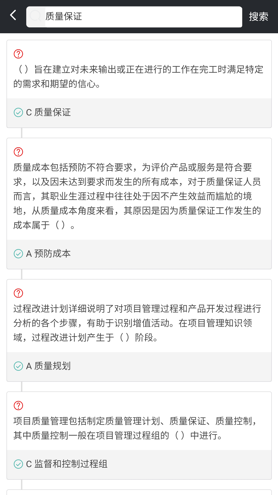 另外,其关键词搜索题库功能很方便。用户只要输入关键词,就能获取到与之相对应内容的试题。例如输入「质量保证」进行搜索,系统就会显示出所有和质量保证知识点相关的试题。