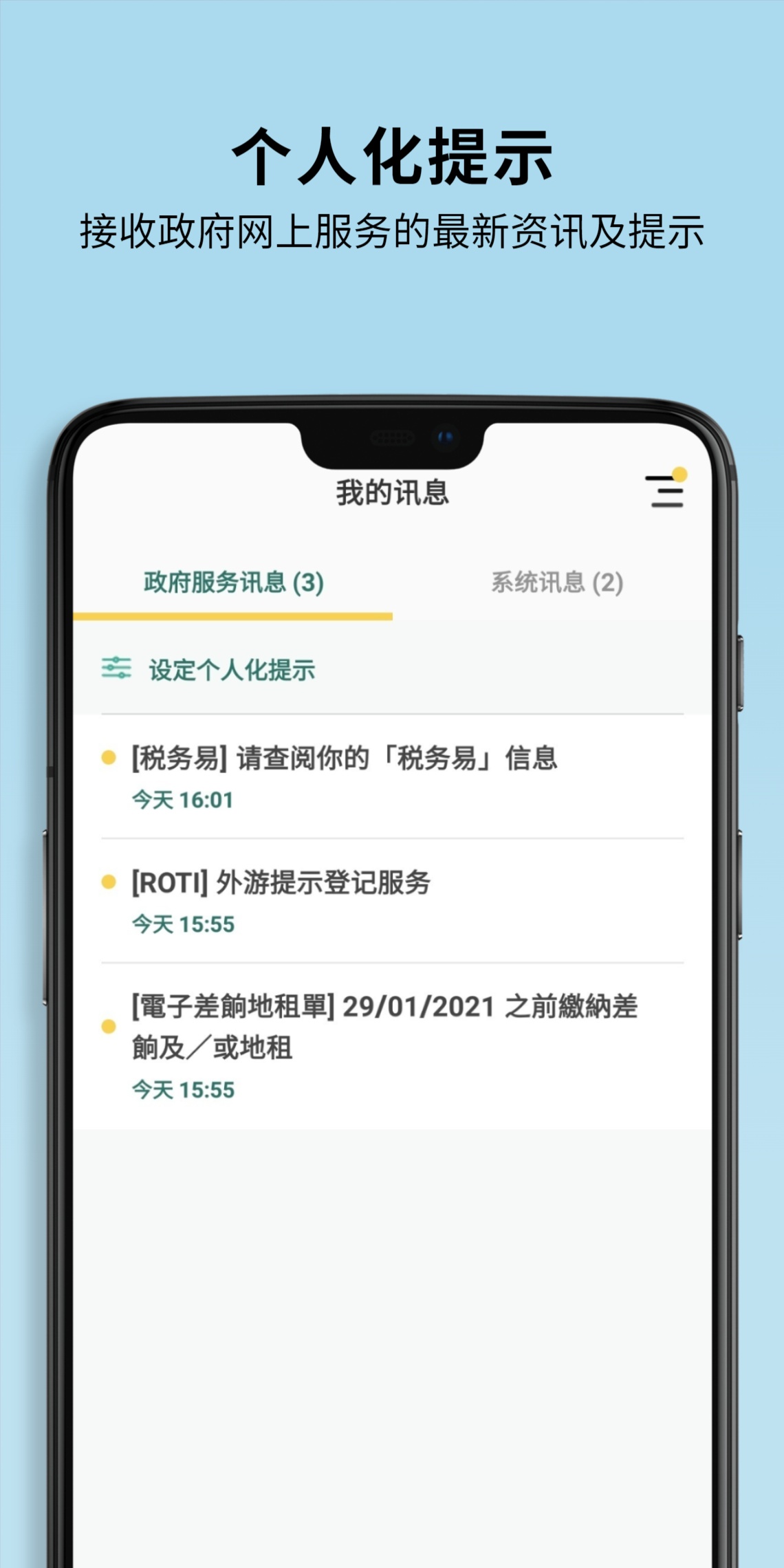 √ 用户可选择接收政府不同网上服务的个人化提示,紧贴各项服务更新、到期提示及最新信息等。