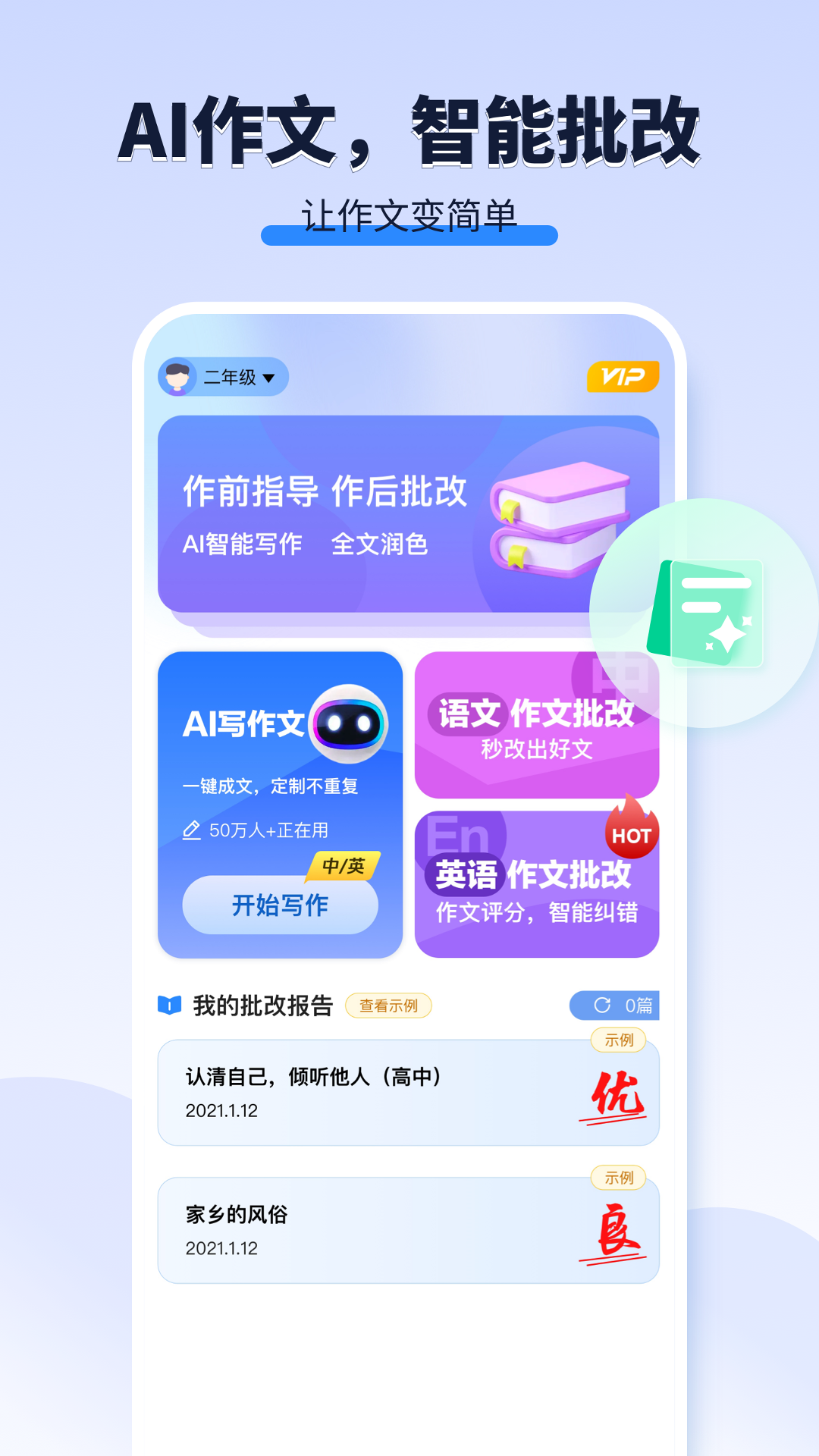 AI智能写作——按要求创作出高质量的内容;作文指导——多维度给出写作思路;作后批改——智能纠错,并给出改进建议。AI让作文变得简单!