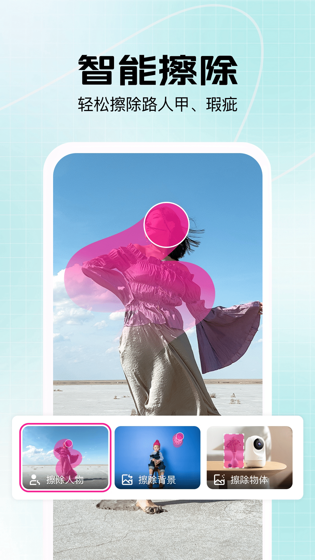 「图片消除」:可以自定义调节涂抹笔刷的大小,轻松擦除所有杂物,像照片中那些不想要的水印、文字、路人或者其他杂物,都能毫无痕迹地删除,简直就是一款超棒的P图神器。