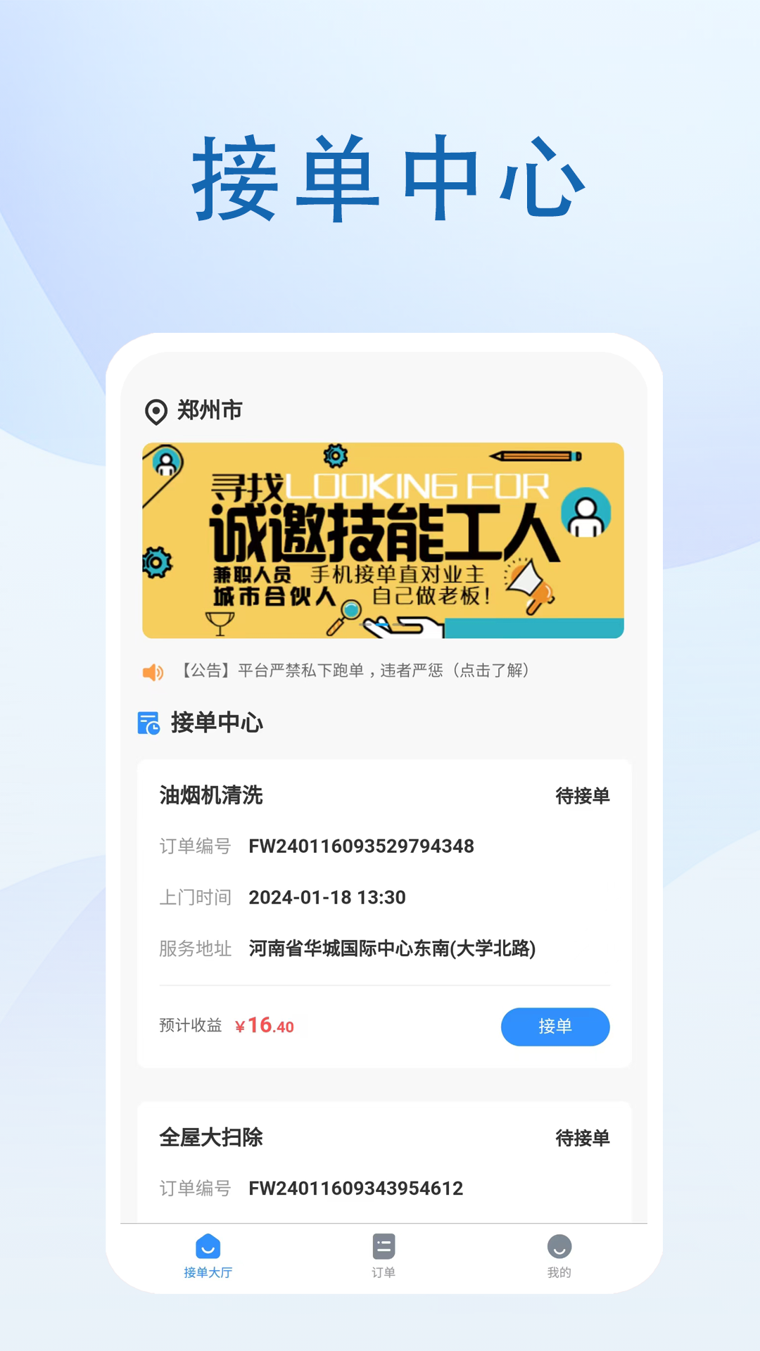 1亿到家商家是一个接单平台,它主要为服务人员提供家政服务相关信息。消费者能够依据该平台所提供的服务资讯,挑选自己所需的服务项目,还能与家政服务人员预约服务时间,平台致力于为消费者提供便捷的家政服务体验。