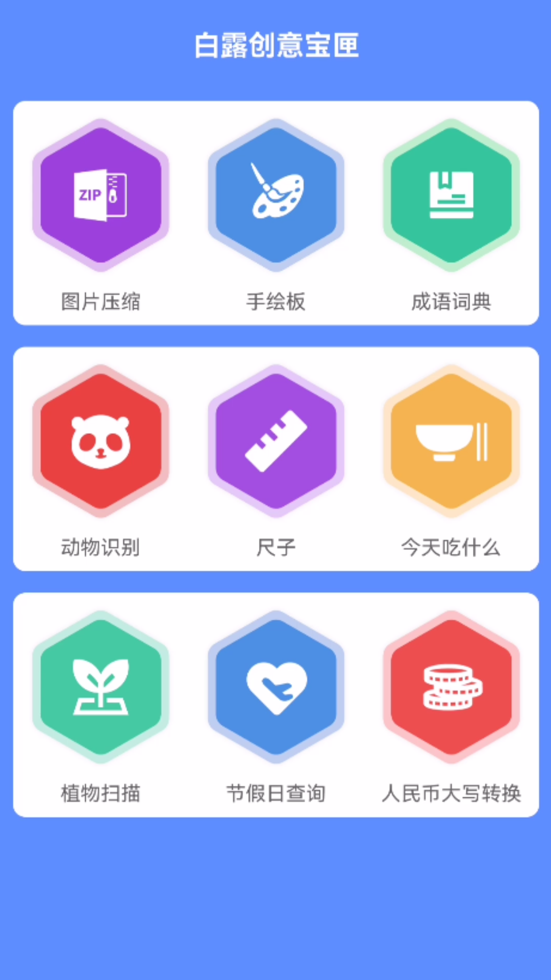 白露创意宝匣是一款多功能实用工具应用,集图片压缩、手绘板、成语词典、动物识别、尺子、今天吃什么、植物扫描、节假日查询及人民币大写转化于一体。无论是日常生活需求,还是创意灵感激发,白露创意宝匣都能为您提供便捷、高效的服务,是您生活中的得力助手!
