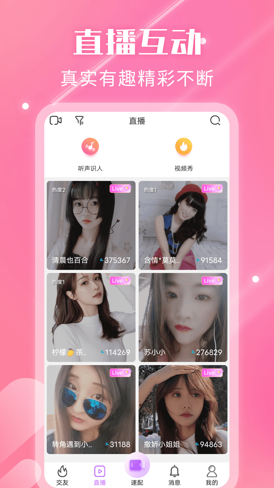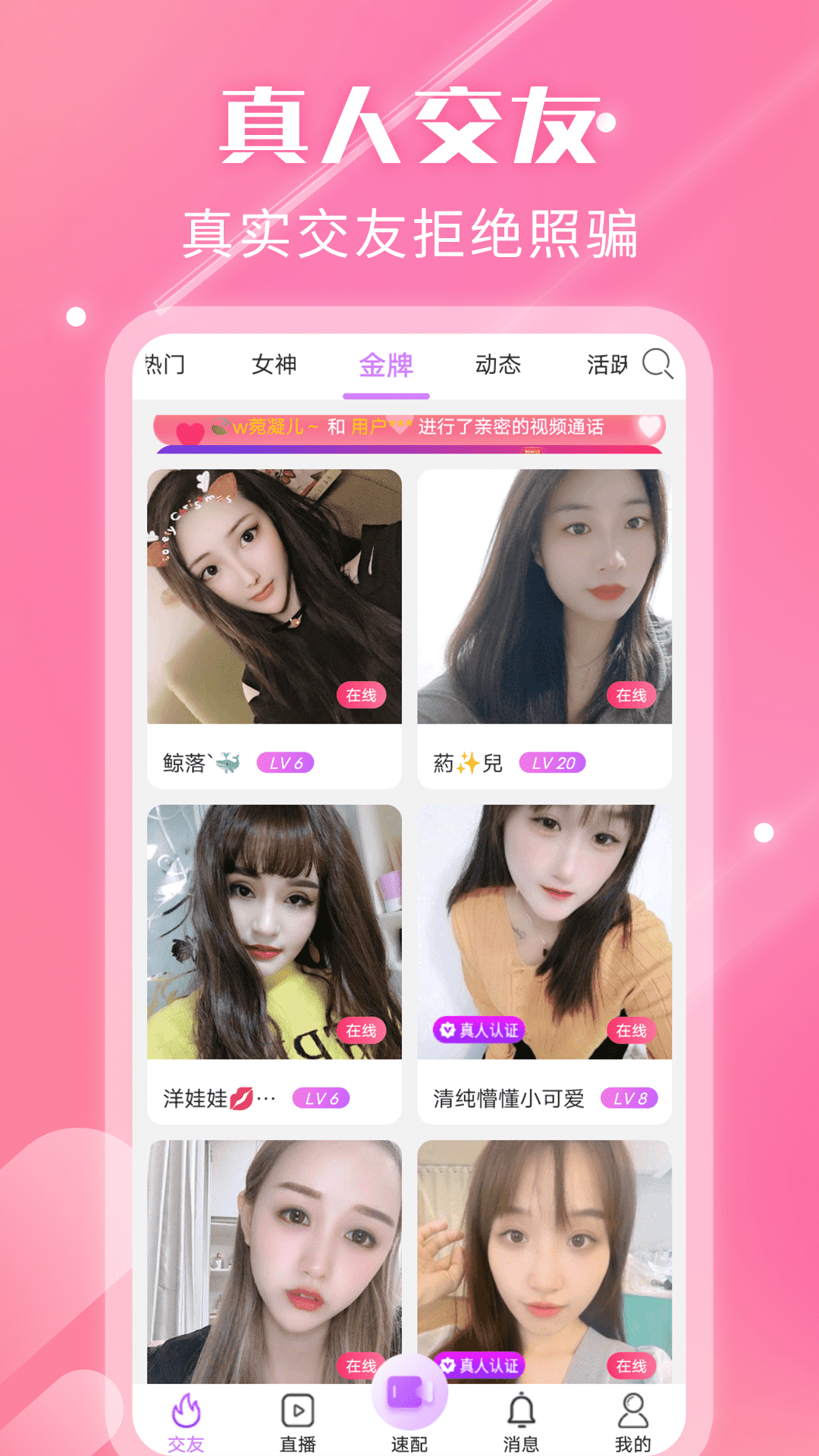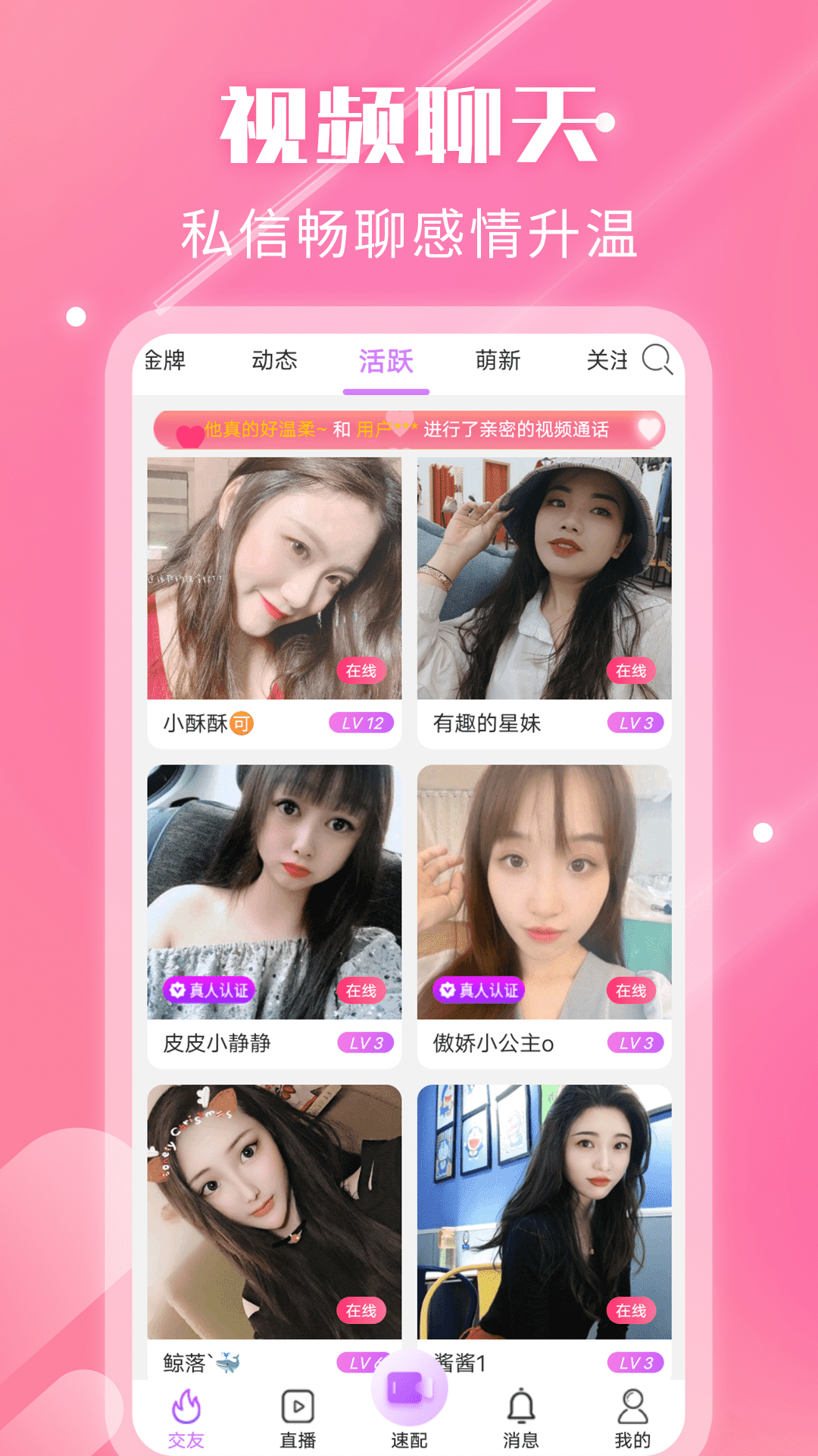 在这里,你可以通过视频聊天交友,进行同城约会聊天,轻松解决男女社交方面的困扰。无论是视频聊天、普通文字聊天,还是语音交友,都是为了帮助你实现真实交友、成功脱单。