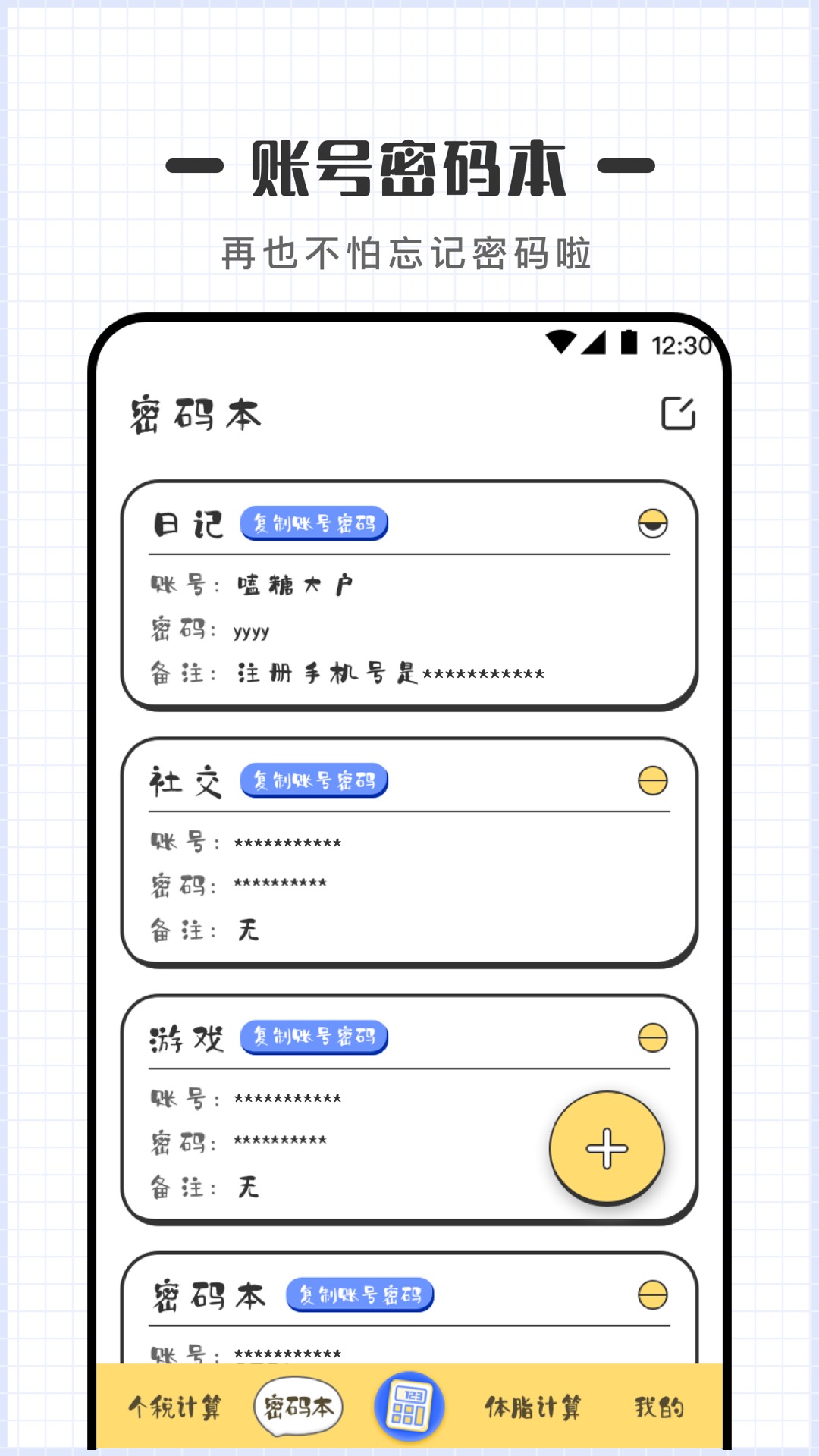 超多可爱皮肤任你更换哦!这款产品特别适合广大女生使用呢。要是你常常忘记各类账号(包括银行账号等)的密码,又或者是因为账号密码太多而记不住的话,那就让密码记录本为你服务吧,它能够帮你记住所有密码并且保障密码的安全。