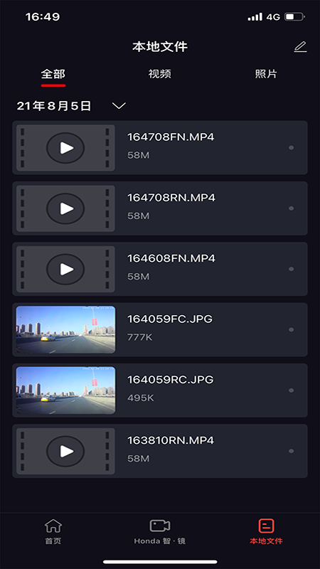 4. 本地文件管理:显示手机中的图片以及从行车记录仪下载到手机的视频文件列表,还能通过删除文件来释放手机存储空间。