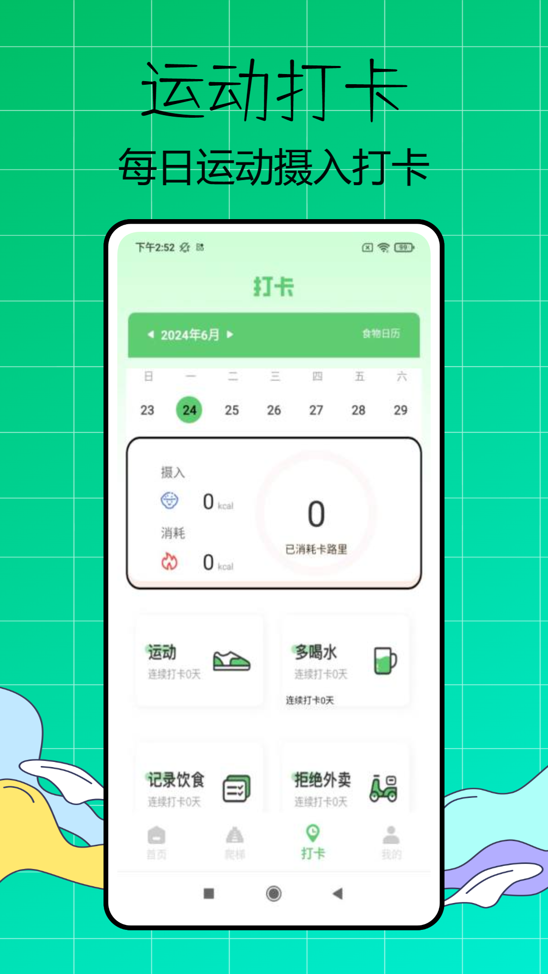 在打卡页面,超慢跑节拍器为用户提供了诸多丰富的健康管理选项,像是运动打卡、喝水打卡、饮食记录,还有拒绝外卖打卡等,从多个维度对您的健康生活进行记录。