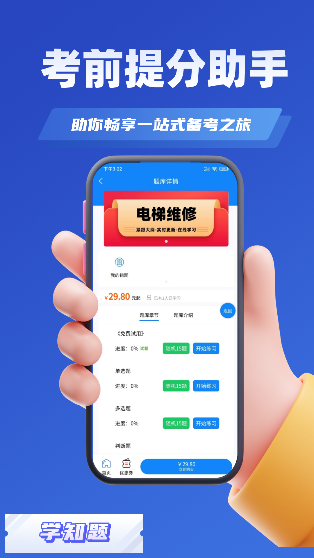 【电梯操作员考试学知题】包含电梯考试的所有知识点,涵盖模拟考场、快速练习、考点练习、测试纪录、错题重做等功能模块,学员通过模拟练习来判断自己缺失的知识点和薄弱环节,通过错题重做功能,来补足学员短板,助力考试通关!