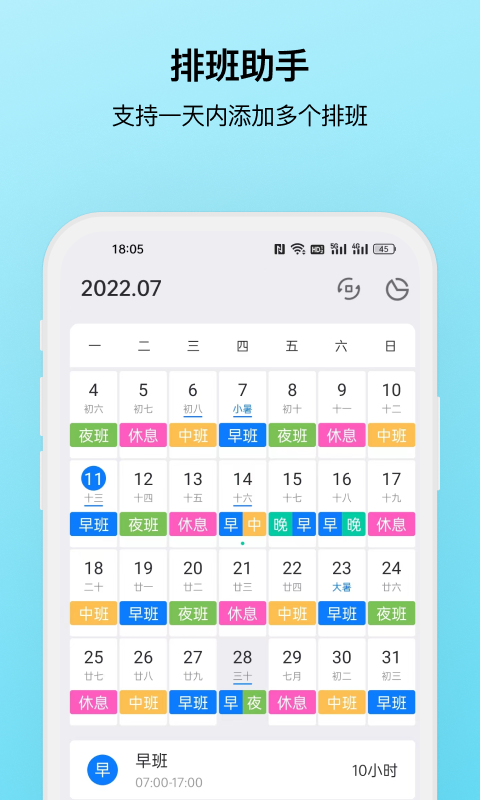 其主界面以月视图日历为基础,能清晰地呈现农历以及节假日信息。只要点击日期,就能轻松添加当日班次。系统默认内置了白班、夜班、休息、早班、中班、晚班等班次,使用者可以根据自己的需求随意增加、修改或者删除这些班次。而且每个班次都能自定义班次颜色、上下班时间以及休息时间。既支持左右滑动以切换上下月,也能够快捷跳转到自定义的年月。