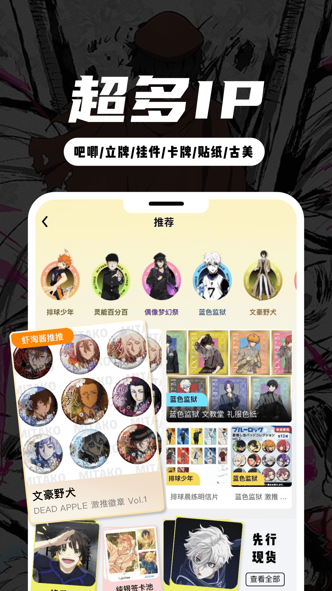 不管您是偶像梦幻祭ES、排球少年、蓝色监狱(蓝锁)、文豪野犬、灵能百分百、时空中的绘旅人、光与夜之恋、未定事件簿、恋与制作人的粉丝,还是奥特曼、假面骑士、神奇宝贝(宝可梦)、龙珠、机动战士高达、游戏王等热门动漫作品的忠实爱好者,MITAKO虾淘都能为您提供各种各样的周边商品哦。不管您对偶像梦幻祭2、meicari、潮物圈、toptoy、hoyoyo、一番赏、盲盒抽卡、任意门、模玩熊、千岛潮玩族、Lofter,或者是煤炉姬、魔法集市感兴趣,MITAKO虾淘都是您吃谷、挖煤、抽卡的理想之选呢。