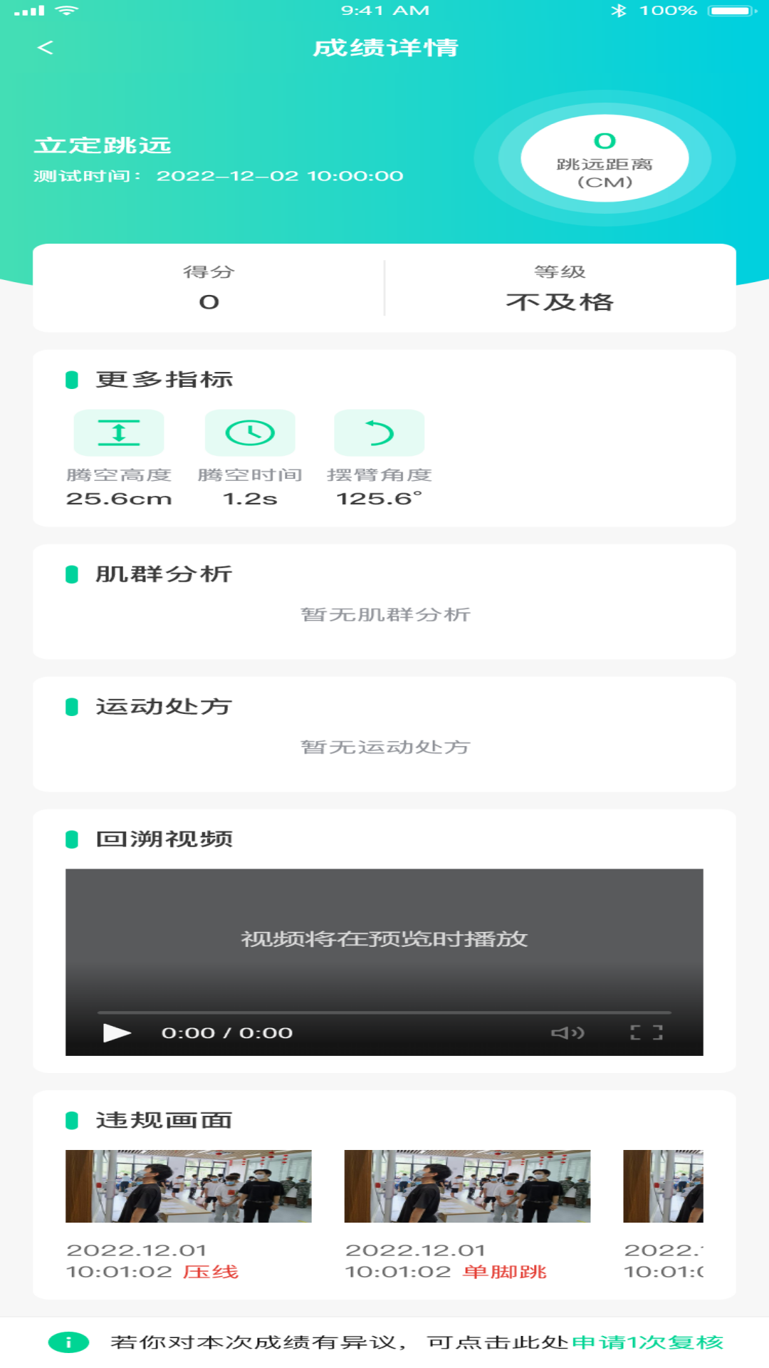 --用户可根据体测规划及个人时间安排,自主进行预约体测及补测,灵活有序,减少集中测试的拥挤与排队烦恼。系统提供详细科学的历次测试分析报告,包含运动过程姿态指标、最终成绩、运动视频、测试评语、科学指导等,综合性的分析报告促进用户身体素质的提高。