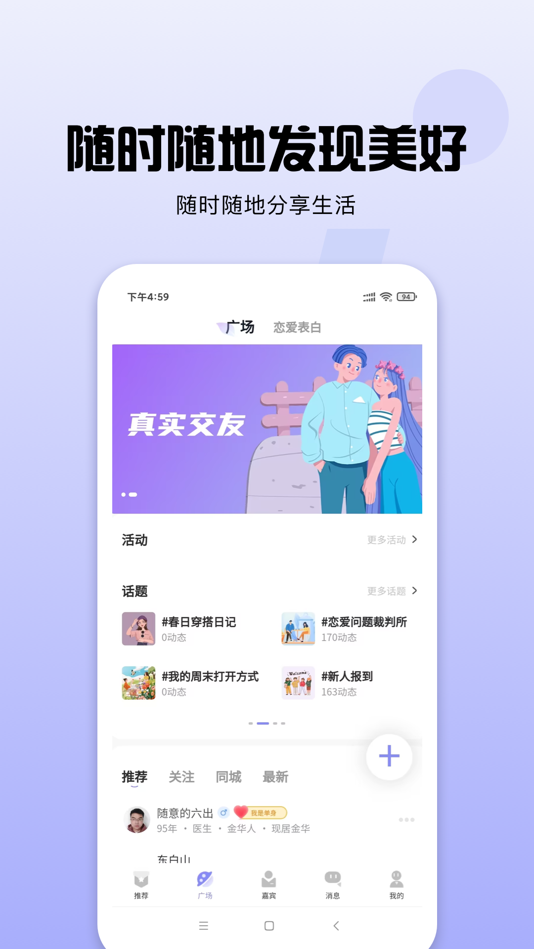 【广场】今生相随构建了用户社区,激励用户表达自己的观点、分享经验和感受,营造出积极向上的婚恋氛围以及良好的社交环境。