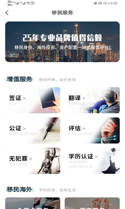 - 出国服务:我们提供多种出国相关服务,如境外公证、签证、国外无犯罪证明开具等方面的咨询;海外房产管理、公司注册、银行开户等中介服务;还有更换美国护照、欧洲居留卡续卡、加拿大团聚移民、取消加拿大枫叶卡、加拿大护照更换、放弃美国绿卡等特色服务。
