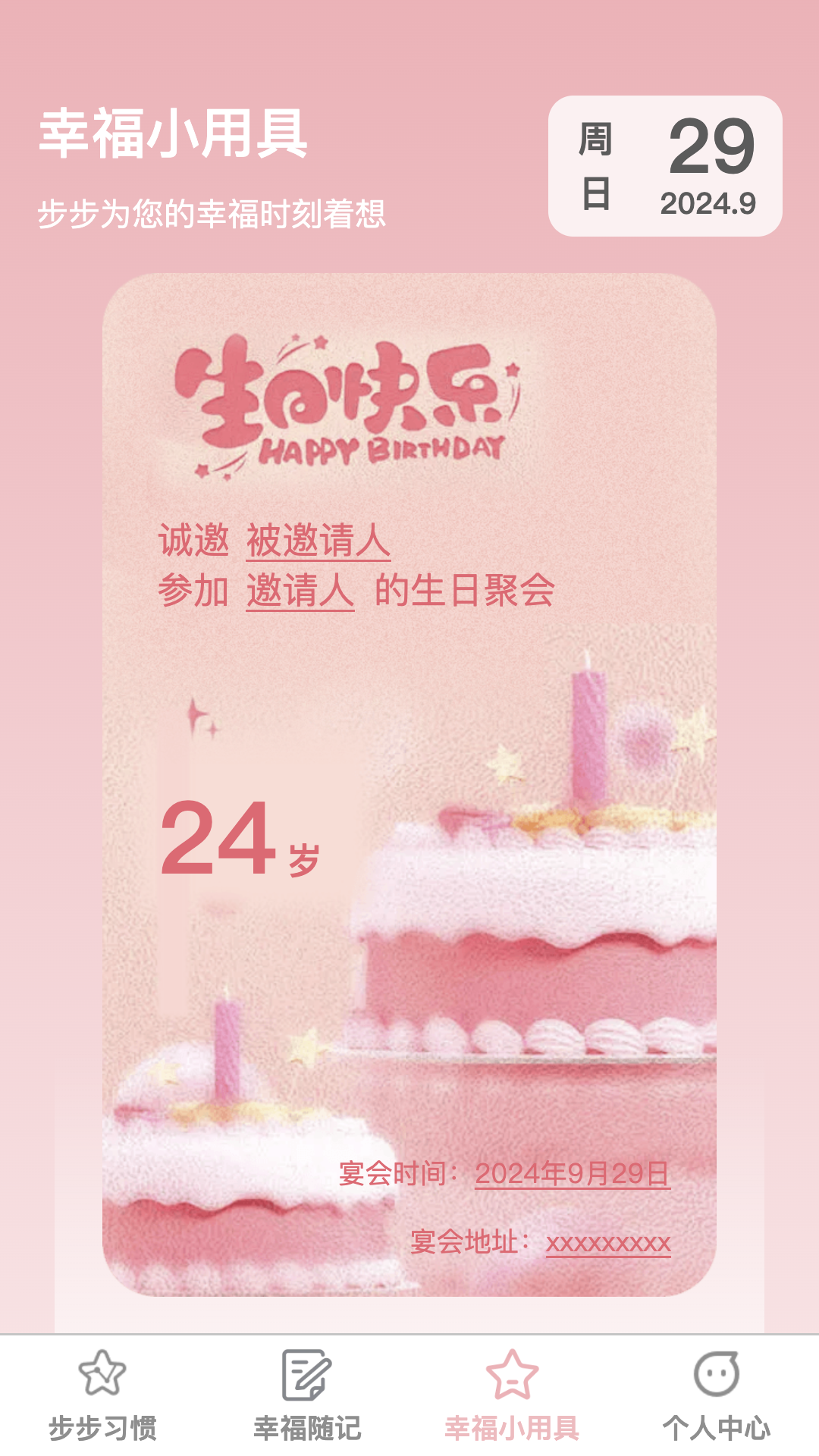 【幸福小工具】幸福步步还贴心地提供了“幸福小工具”功能,用户可以轻松制作精美的请帖,适用于各种场合,如生日派对、婚礼邀请等。内置模板和设计元素,让您可以尽情发挥创意,制作出符合您风格的独特请帖。