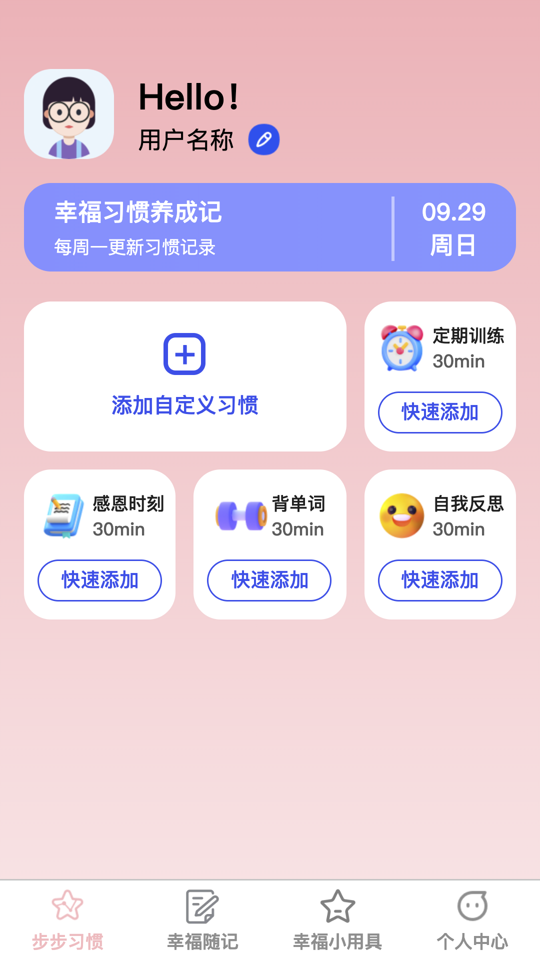 【步步习惯】在步步习惯模块中,您可以轻松设定和追踪自己的生活目标,培养健康有益的日常习惯。无论是锻炼身体、阅读、还是提升个人技能,幸福步步将为您提供个性化建议,鼓励您坚持下去,逐步迈向更美好的自己。