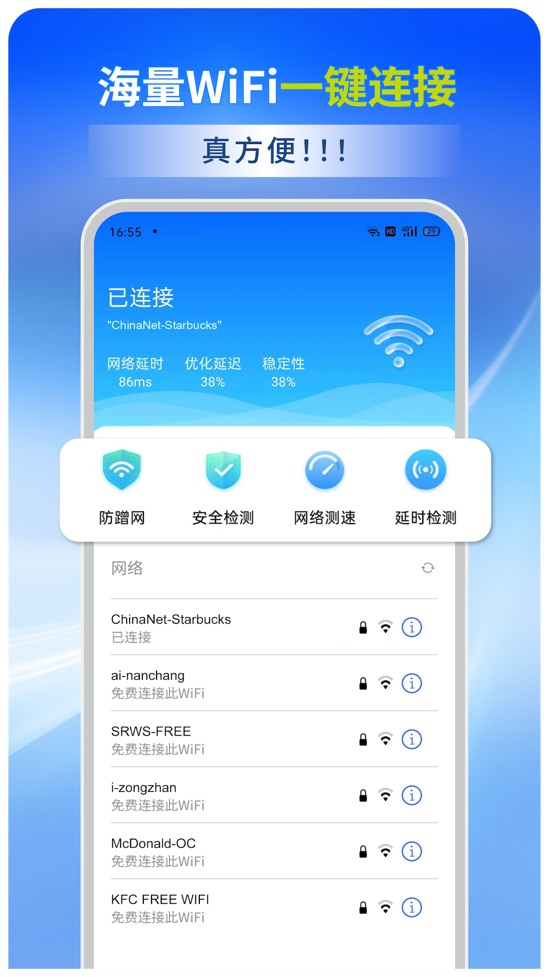 WiFi全能连app是一款具有防蹭网、网络速度检查、安全测试、网络延时以及无线网连接等功能的app,能够为用户提供检查wifi网络是否被监听、加密等功能,为用户提供更安全的免费wifi网络