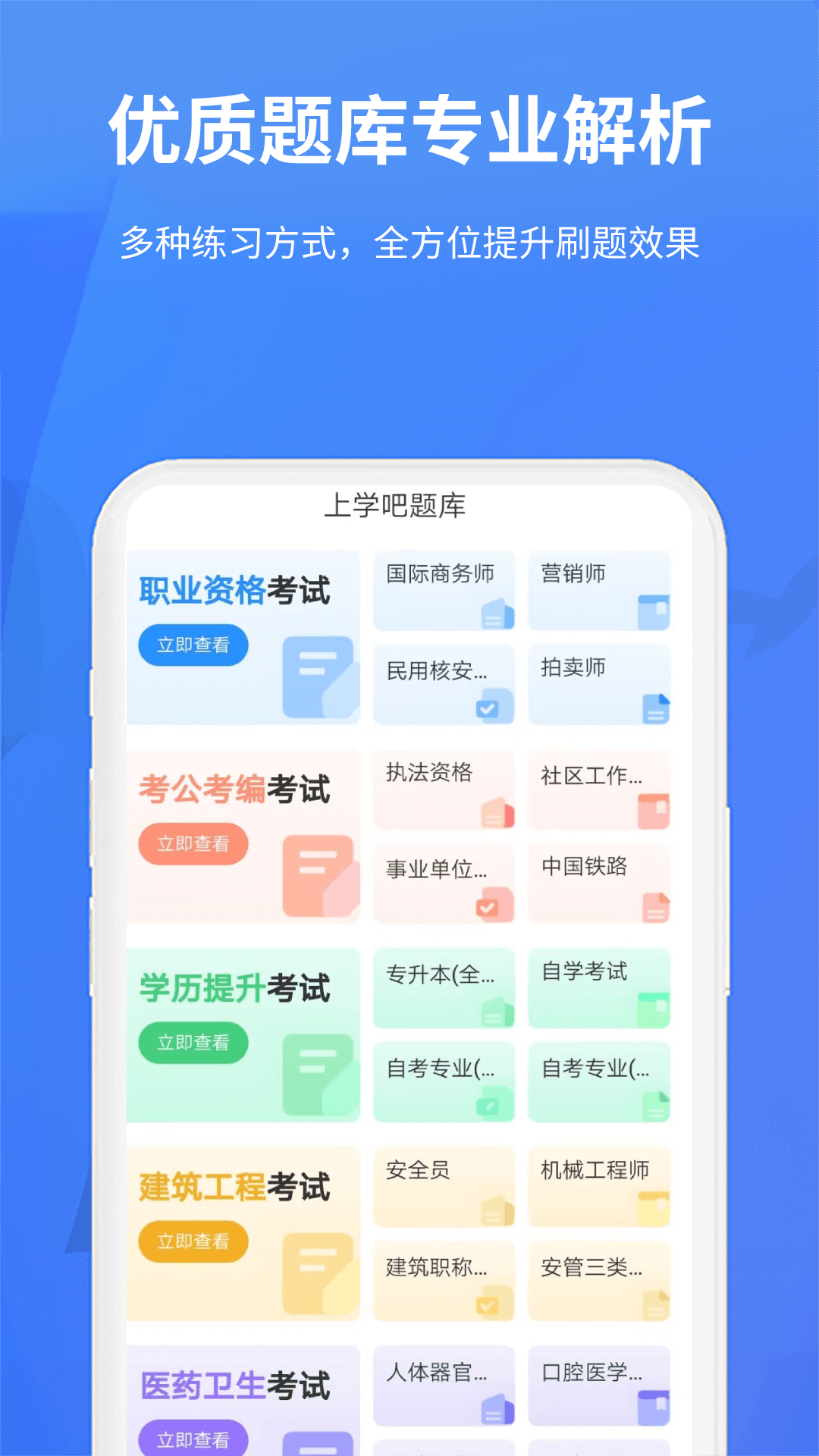 上学吧题库APP汇聚了数量众多的试题资源,这些试题涵盖了各种各样的考试类型。用户可借助此APP在线练习多种试题,有效提升考试复习的效率。