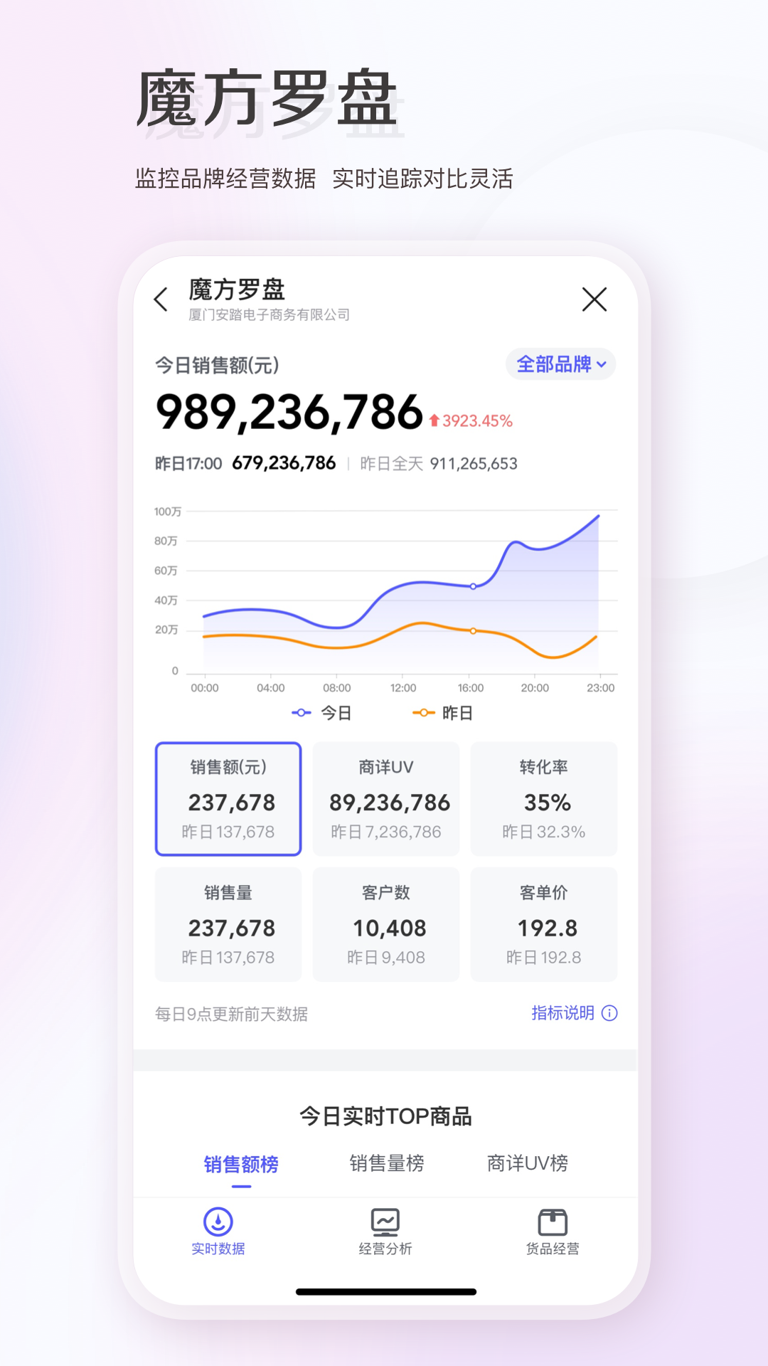 3. 魔方罗盘:实时监控品牌经营数据,支持多维度查看商品数据。