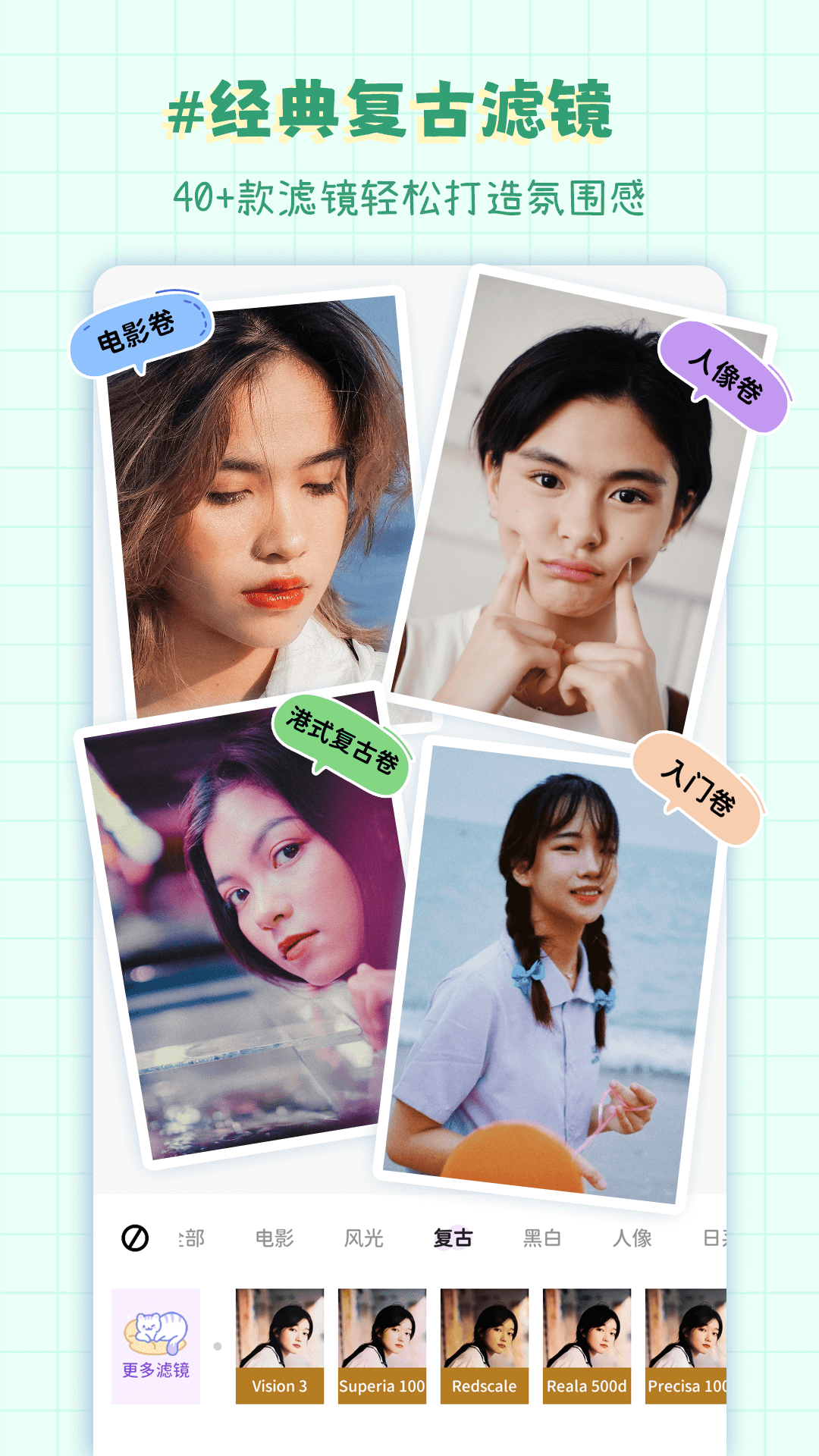 40+精美滤镜,"人像"、"风光"、"日系"、"复古",不管你是拍美食、自然风光还是人像,总有一款适合你呦~