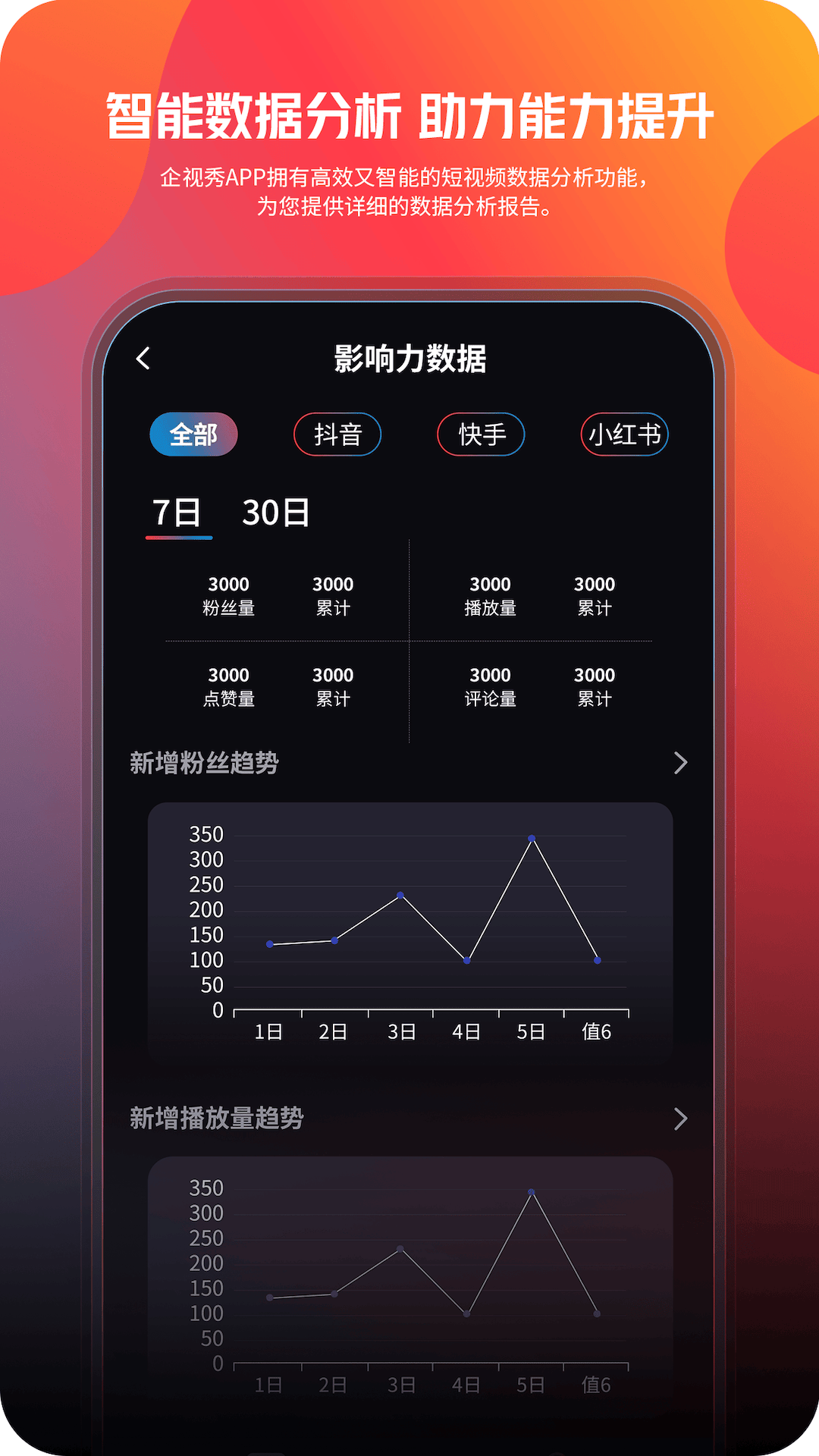 只需动动手指,企视秀便可将您的作品一键推送至各大主流短视频平台,让您轻松享受粉丝的点赞、转发和评论。每日查看互动数据,感受与粉丝的亲密连接!