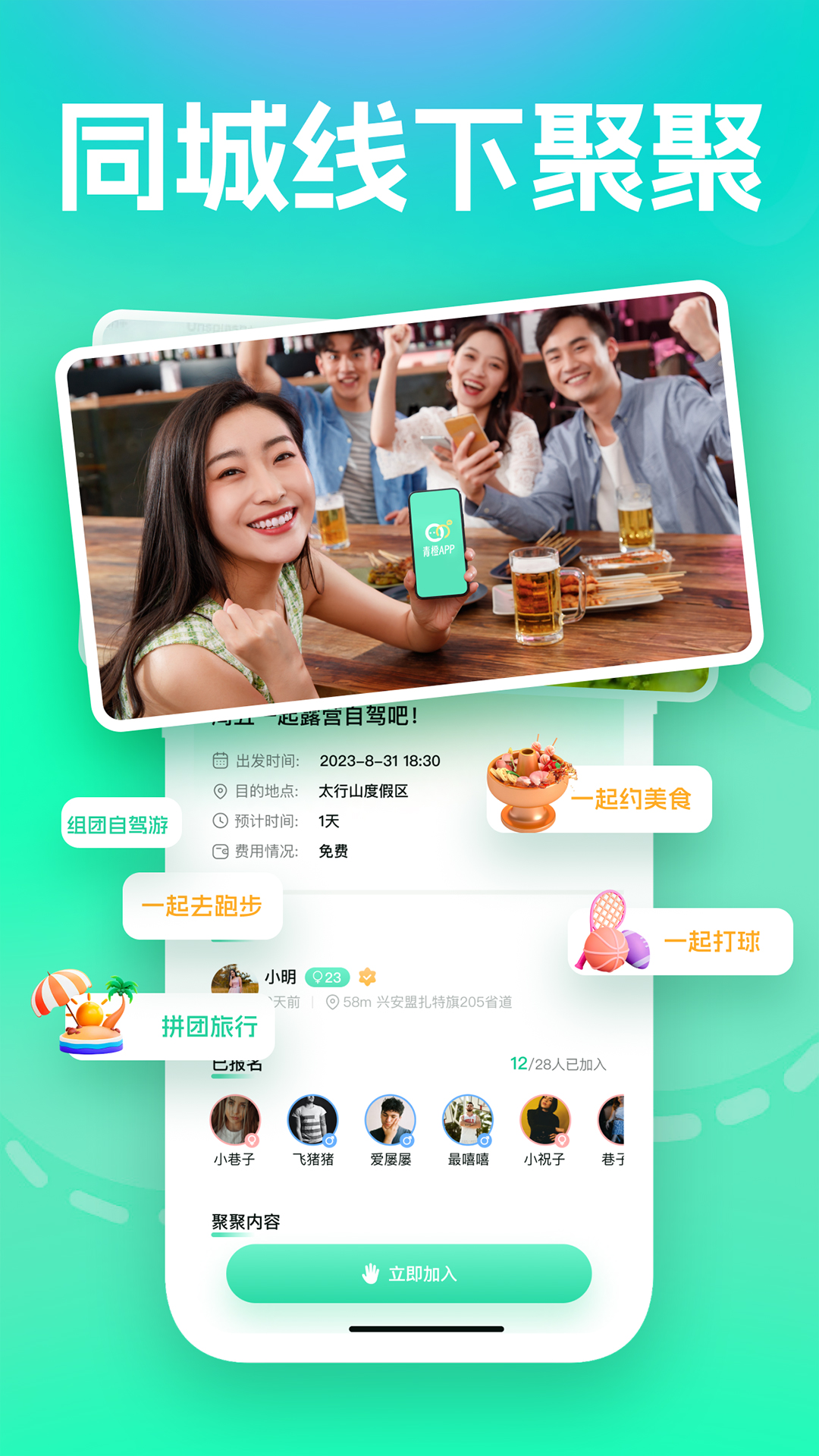 青橙的线下聚聚是多人的聚会活动哦。在这儿,你能够轻松找到和自己有相同兴趣爱好的朋友呢。不管是打篮球、野餐、组团自驾游,还是组织线下游戏之类的活动,只要你加入青橙就会发现,原来交友不是什么难事呀。