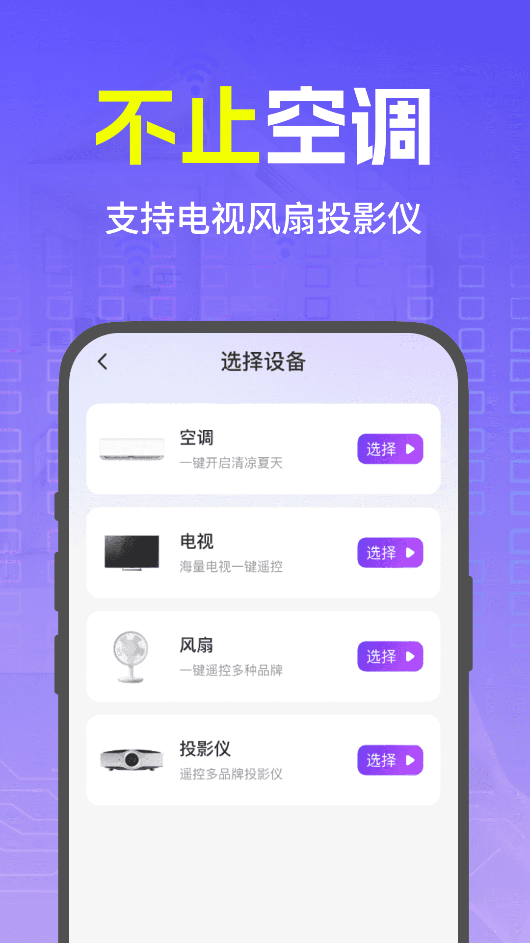 空调遥控大师能够轻松实现用手机遥控多种家电,像是空调、风扇、电视、机顶盒以及投影仪等,是您智能生活的首选伙伴。